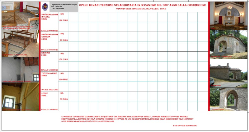Cari confratelli,consorelle, amici. La Misericordia di Tiglio per finanziare i lavori di manutenzione straordinaria, in occasione del 300° Anno dalla costruzione dell’Oratorio delle Seggiane, chiede a tutti voi un contributo economico, acquistando una o più unità dei lavori sotto indicati.