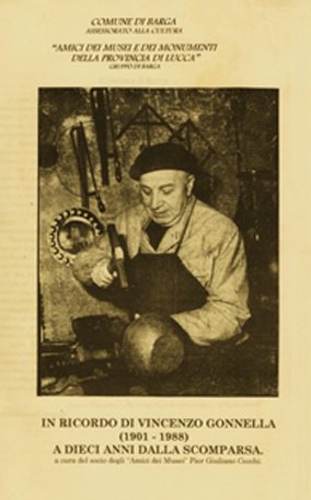 In questo 2013 ricorrono i venticinque anni dalla morte di Vincenzo Gonnella e credo che difficilmente possono esser dette parole più intense di quelle pronunciate dal sindaco di Barga Alessandro Adami nel giorno dell’inaugurazione della lapide che ancora oggi lo ricorda a tutti e soprattutto rievoca il suo pregevole lavoro d’artista: era il giorno di S. Giuseppe artigiano, il 19 marzo 1989. La lapide fu posta ed è ancora visibile in vicolo Orsini, a fianco della sua bottega che da anni ha la porta chiusa, e fu scritta dall’allora direttore del Giornale di Barga prof. Umberto Sereni: