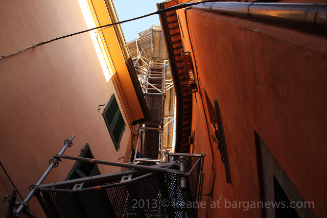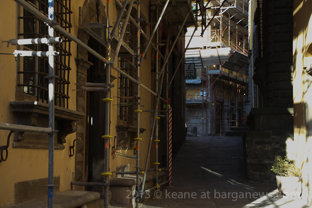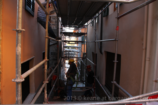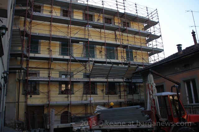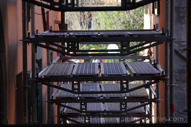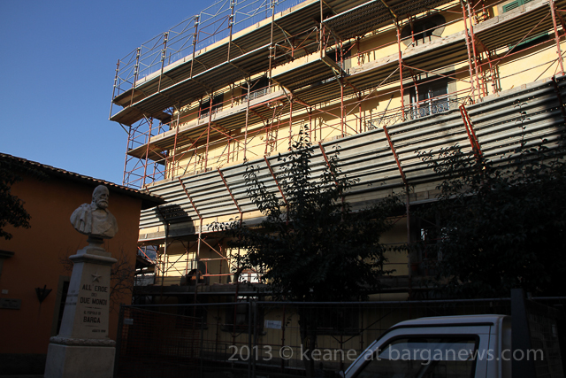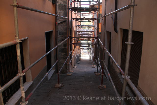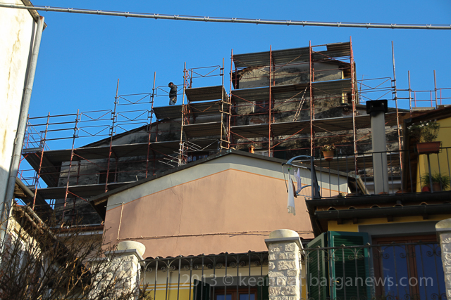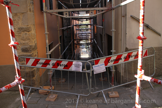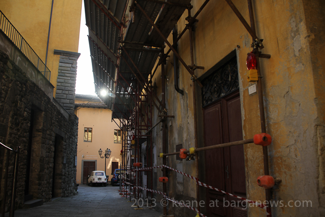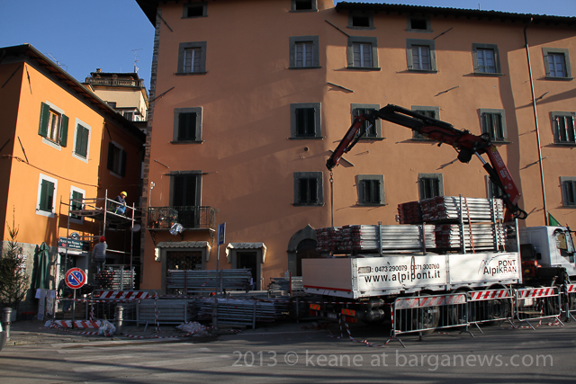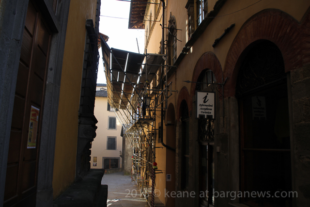 The scaffolding which has been covering the Palazzo Pancrazi – the town hall has now been joined by much more metal work and poles as scaffolding has been erected on the palazzo overlooking Piazza Garibaldi (article here) and the even larger Palazzo Biondi (article here) which overlooks the two bridges which divides Barga Vecchia from Barga Giardino.