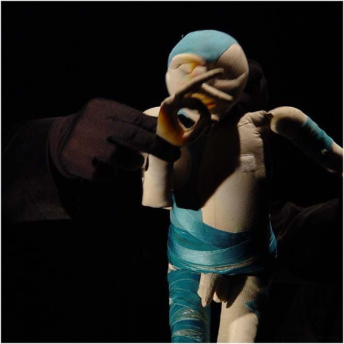 A multi media experience in the Teatro Dei Differenti using the minimum of props, some very effective lighting, a very powerful sound track and just the most beautiful puppets I have ever seen – From the barganews.com archives 2004