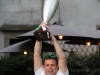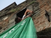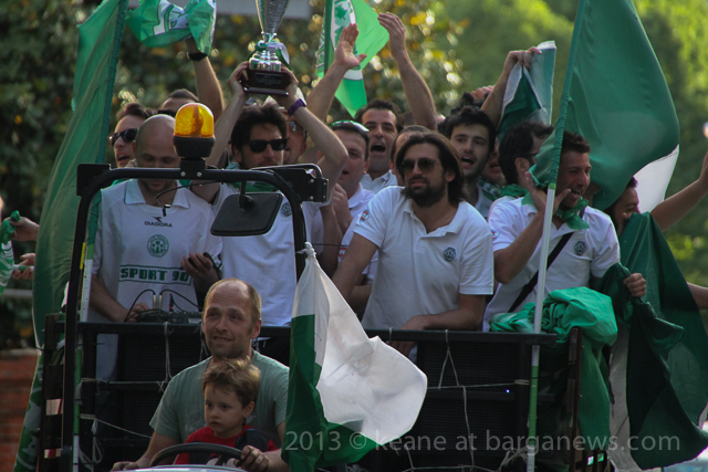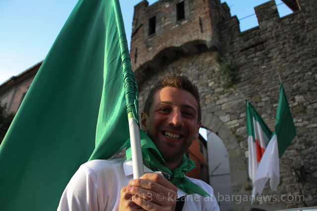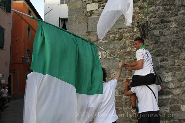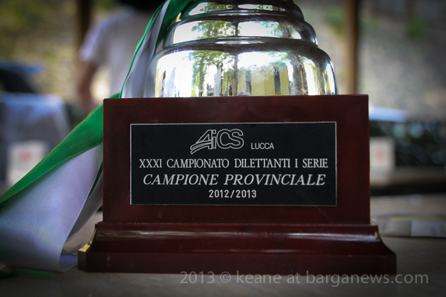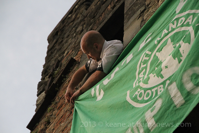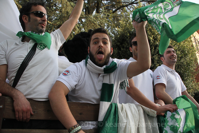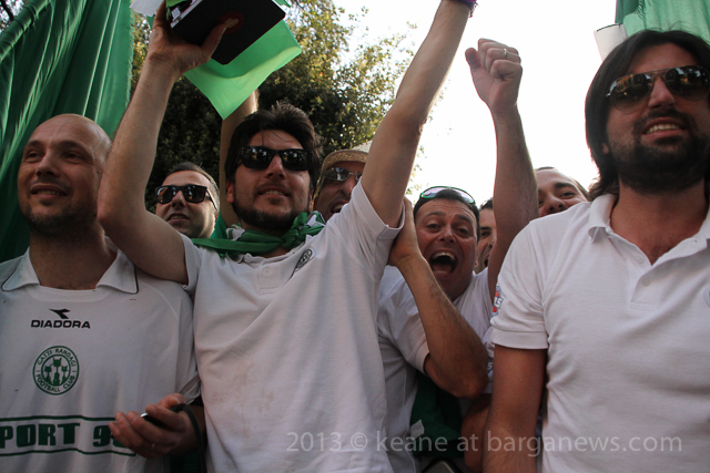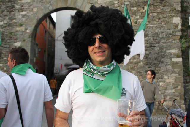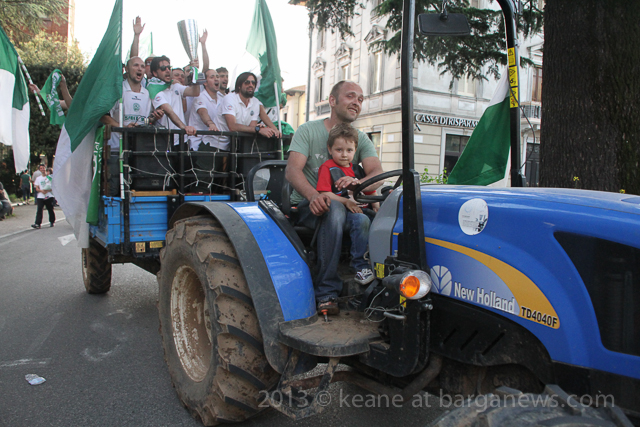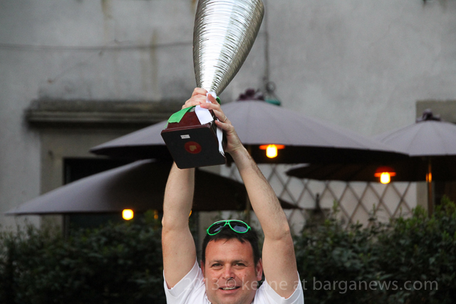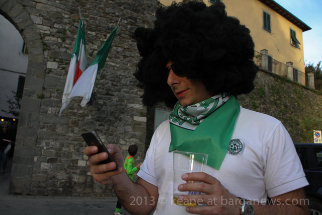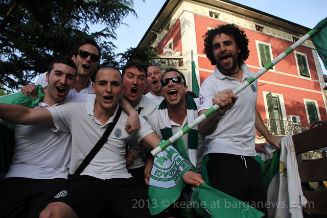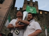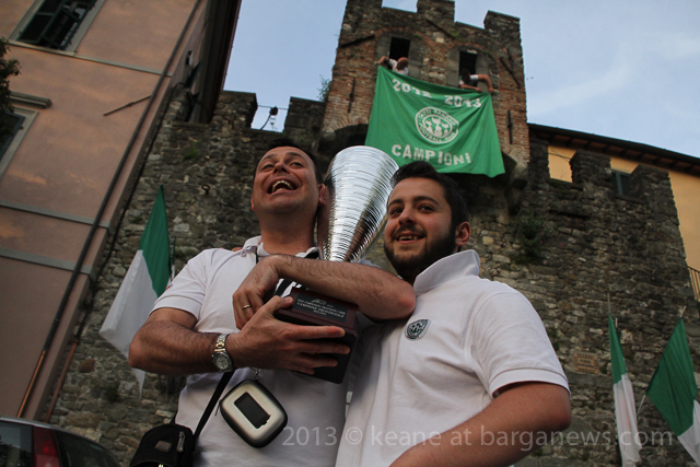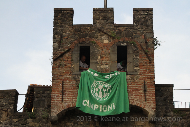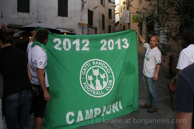 As you can hear in the audioboo below, the team were celebrating in style at Riccardo’s outside the main gates of Barga Vecchia and just to let people know were they were and just what was going on, they occupying the main gate into the city draping huge Gatti Randagi Champions flags from the top of the medieval entrance to the city.