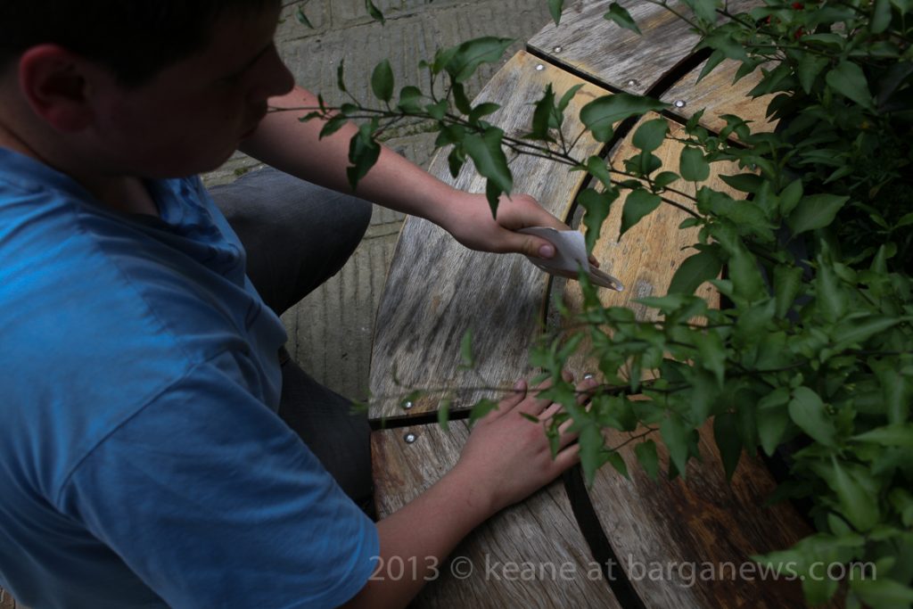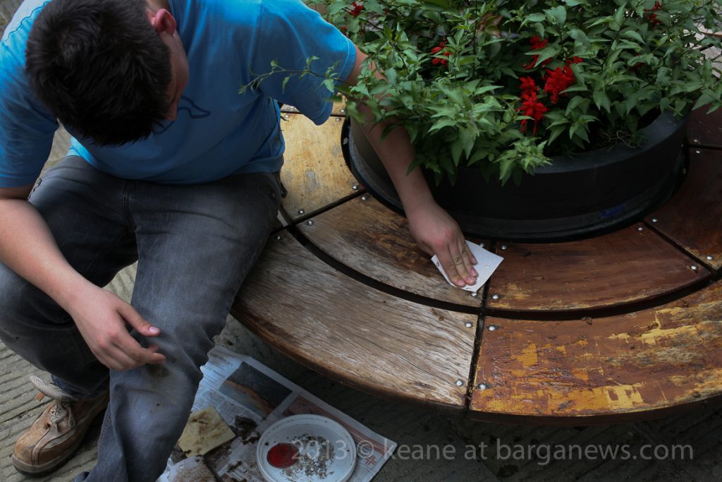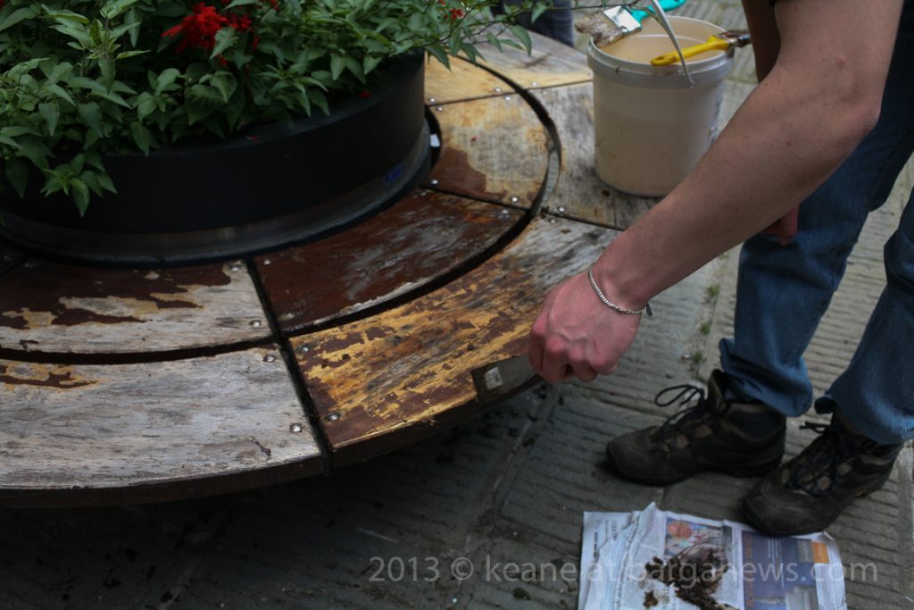 This week volunteers started work on renovating the circular seats as the recent hard winter conditions had reduced the wooden slats to a peeling mess.