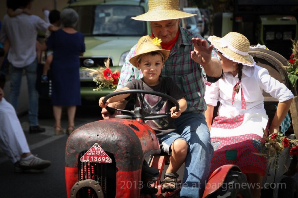 Una dopo l’altra, le vecchie macchine agricole erano decorate come carri nuziali: nelle fessure della parte anteriore erano infilati grandi girasoli giallo oro in piena fioritura, insieme a mazzi di spighe mature; alcuni trattori avevano persino, sul davanti, grandi ghirlande fatte di fiori di campo freschi.
