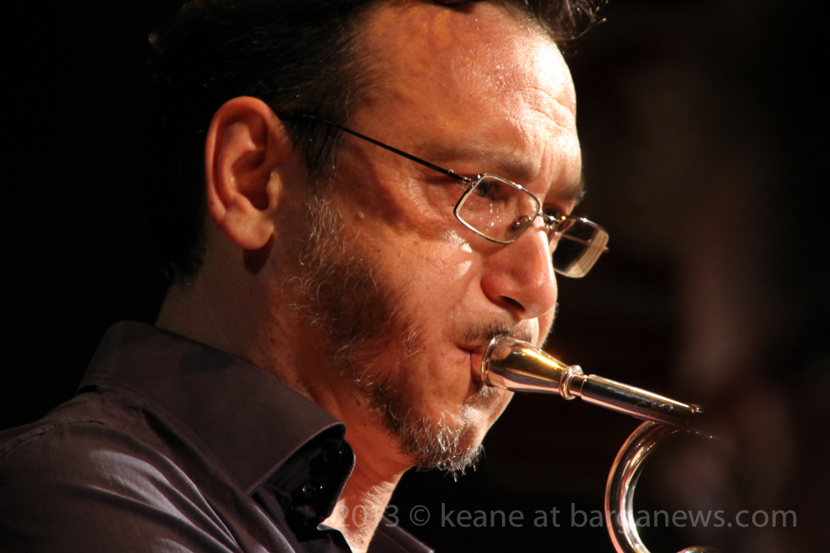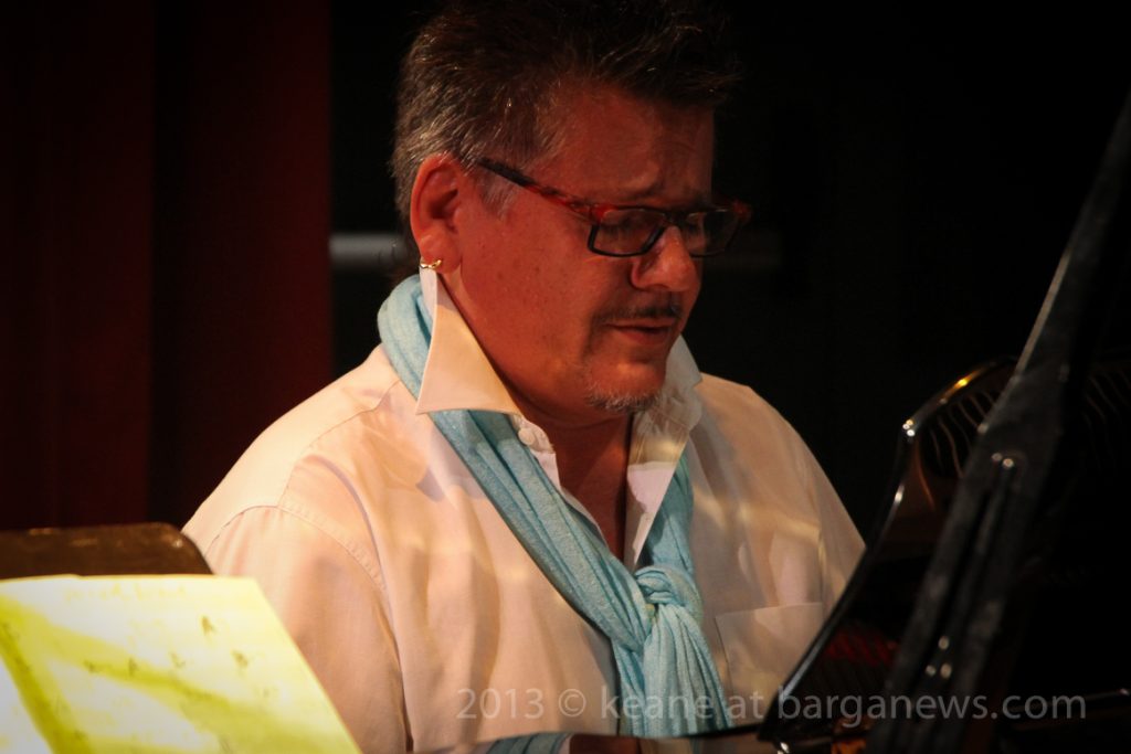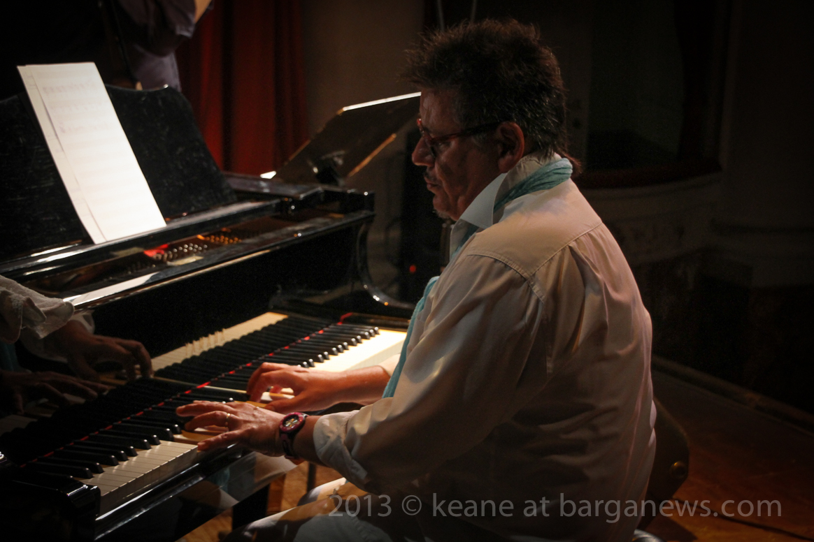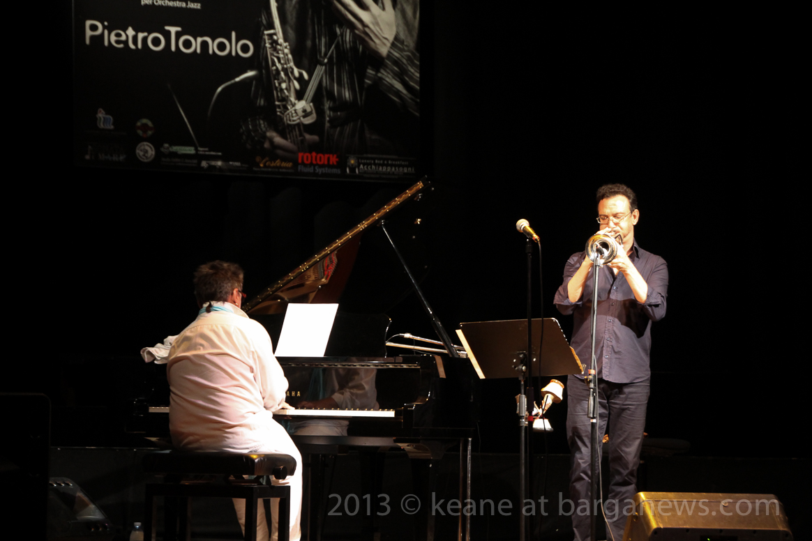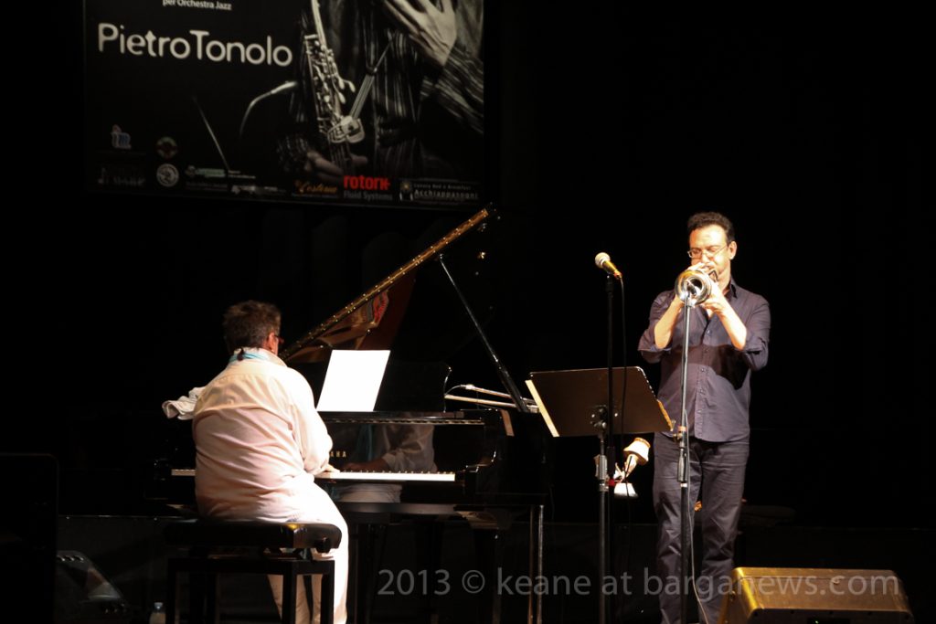 “Rain stopped play this evening” in Piazza Angelio but it did not stop the music – it simply moved inside to the Teatro dei differenti as Riccardo Arrighini on piano and Aldo Bassi on trumpet romped their way through some classic Italian tunes in the Arrighini style with some very imaginative arrangements.