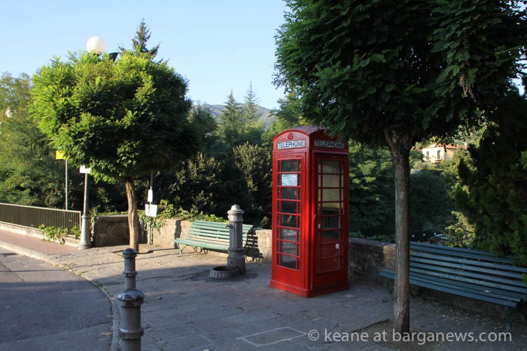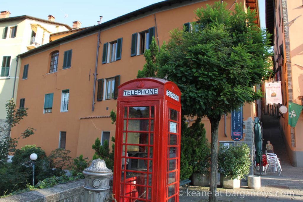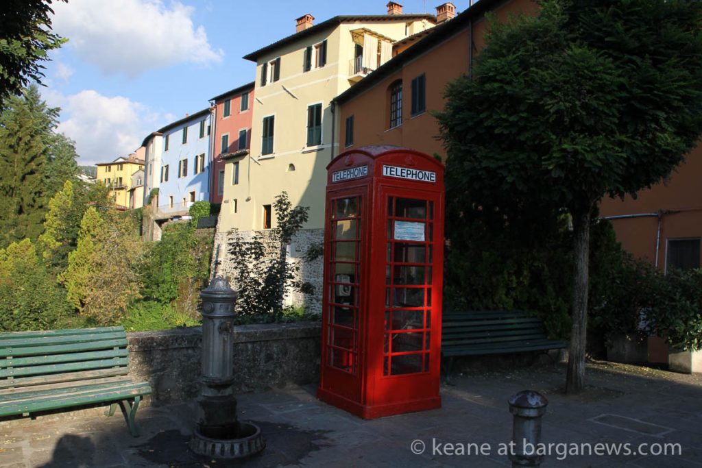 A new look to the bridge joining Barga Vecchia and Barga Giardino this morning as a bright red British telephone box was winched into place and installed in front of a curious group of onlookers unsure as to just what was going on. In fact the telephone box is a gift to Barga from retired fish and chip shop owner Mauro Cecchini – who’s family were originally from Barga but who has been living and working in Edinburgh Scotland for many years.