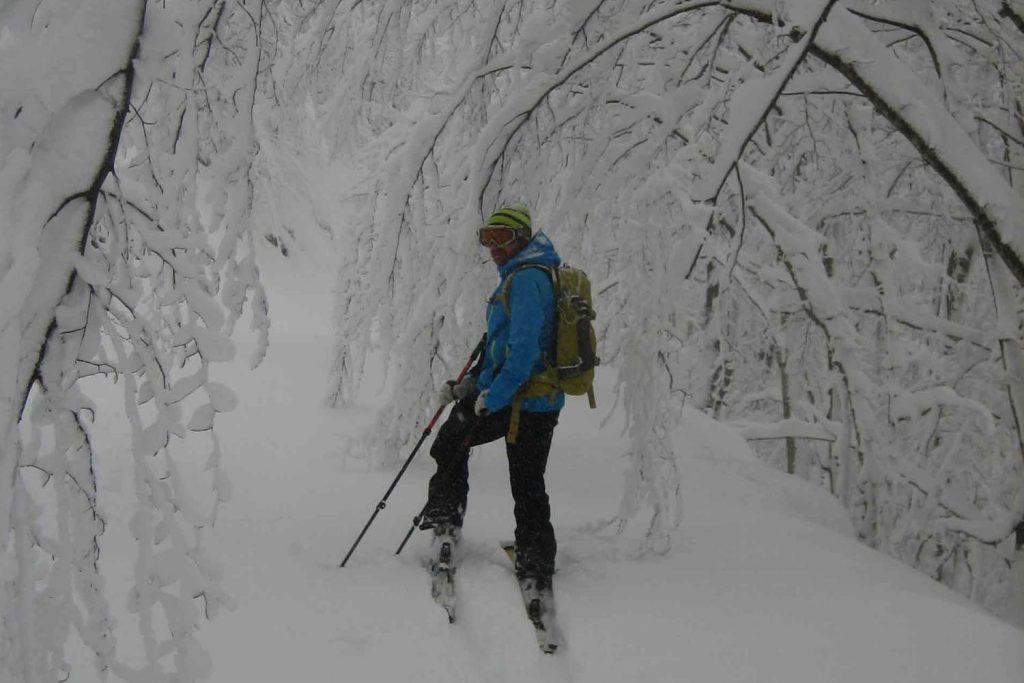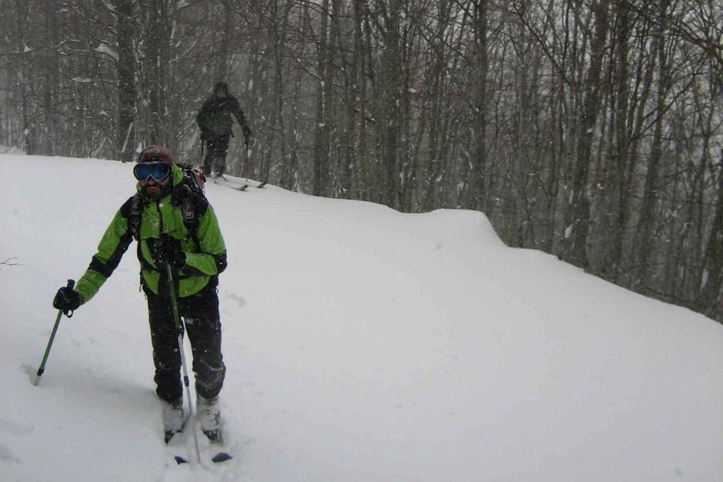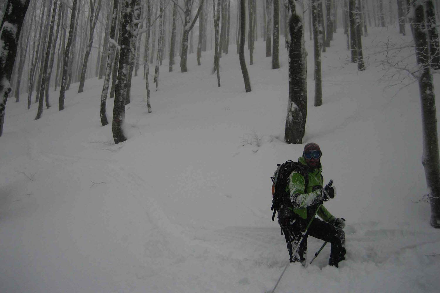 Durante tutta la notte la bufera di neve e vento non ha cessato un minuto. Sabato mattina, dopo esserci svegliati e fatto colazione, Naik, Oriano ed il sottoscritto siamo saliti fin dove finisce il bosco ed inizia la nuda, sul sentiero che porta al Lago Santo. Oltre la visibilità era veramente pessima e senza punti di riferimento. Tolte le pelli e stretti gli scarponi siamo scesi lungo il pendio girato a nord che arriva a Capo Corsonna. E qui veramente sembrava di sognare: neve alle ginocchia e spruzzi in faccia da toglierti il respiro, il vento cessava e i faggi coi loro tronchi bianchissimi, lasciavano filtrare poca luce che creava un atmosfera tutta particolare. Ma davvero è il 23 Novembre?