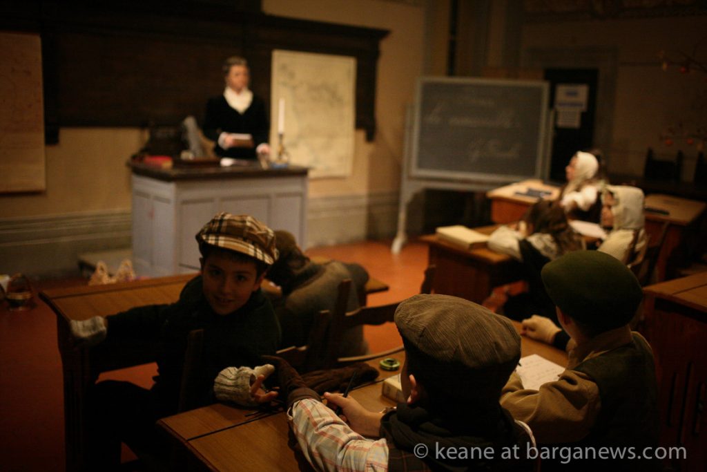 Looking at them the date should be somewhere around zero. The Roman centurions and census takers (speaking in Latin) would seem to confirm that date but just before Mary and Joseph and their donkey arrived in the census room, their first port of call was to a schoolroom with desks and chairs, pupils and a teacher all meticulously wearing clothes dating from probably the 1930′s. Outside of the school two guards stand both dressed as soldiers from the 16th century.