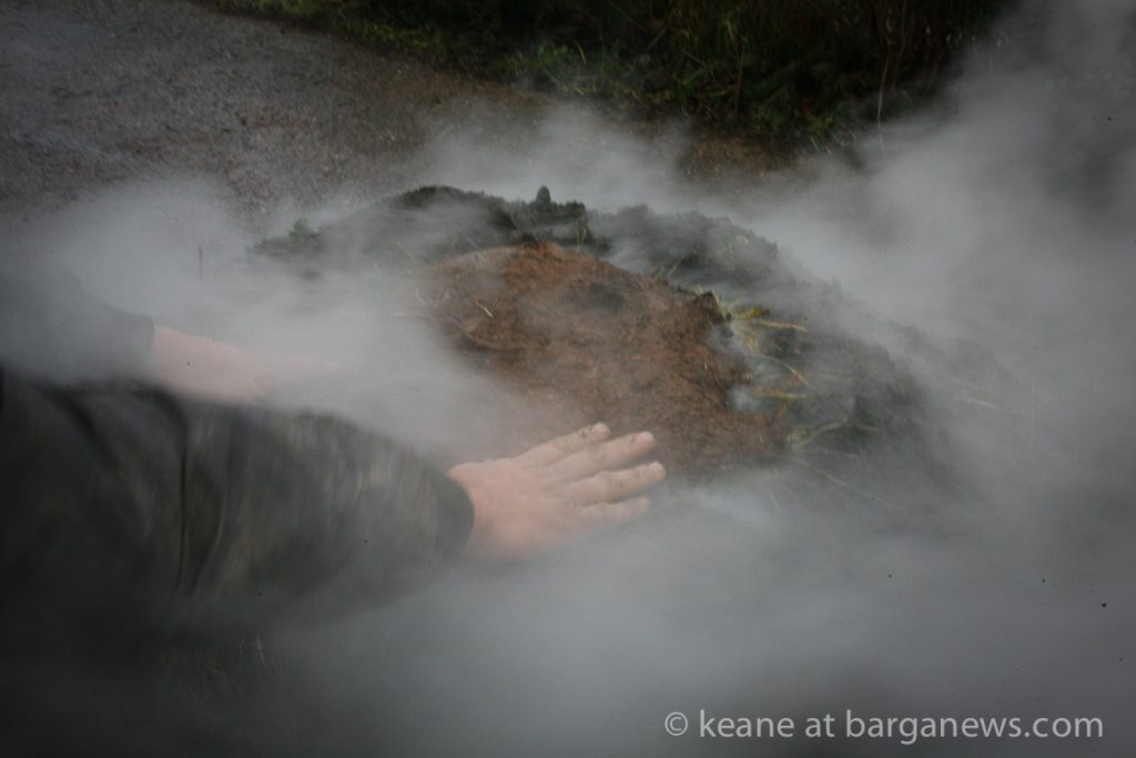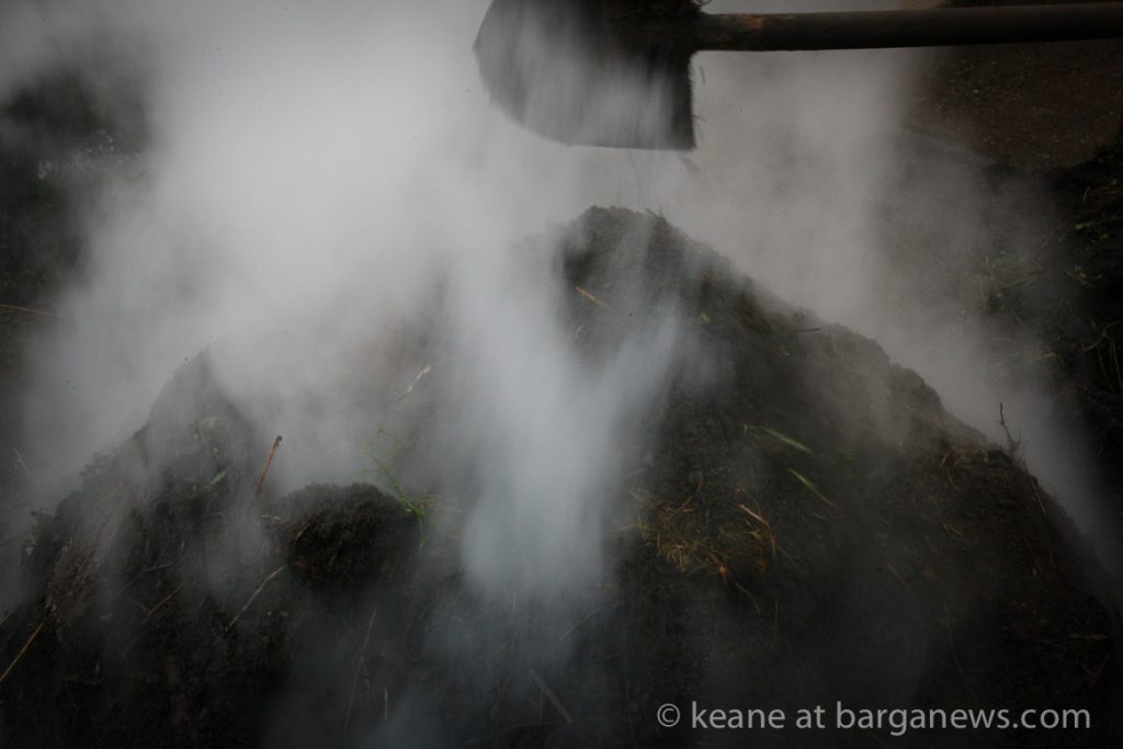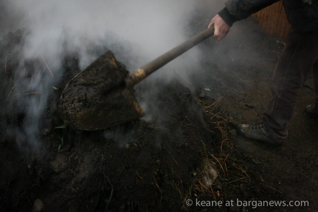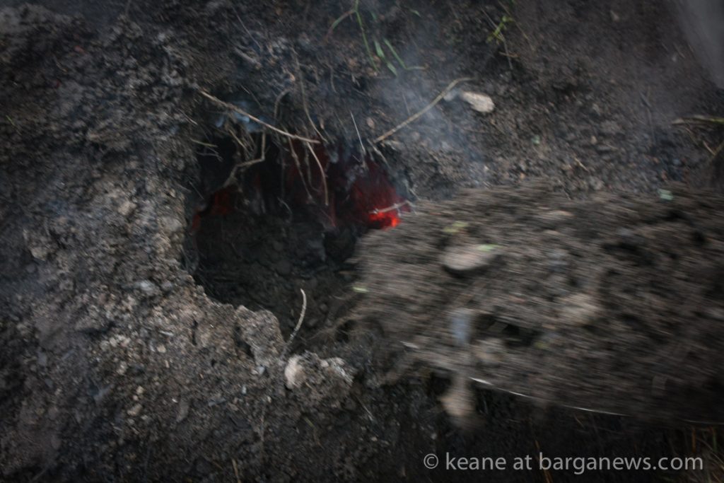 And there was one of the main problems for Giorgio as obtaining and maintaining over the whole period of the burn effective sealing against air, and good circulation, are the main factors limiting the success of a good burn or not. Changing winds and circulation around the mound means uneven burning or holes appearing which have to be covered up straight away to keep the oxygen out of the system. Torrential rain the following morning added to his problems.