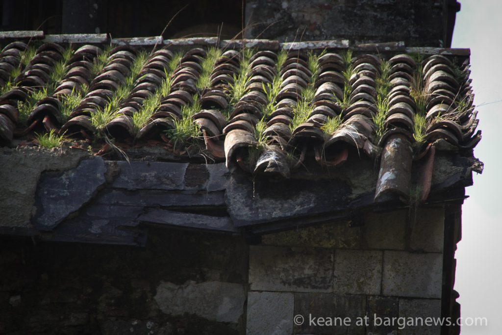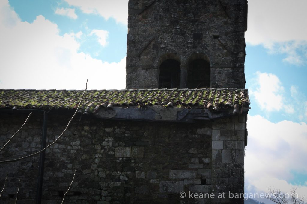 The church of Santa Maria di Loppia just outside Barga is looking a bit worse for wear this week as part of the overhanging wooden support for the terracotta tiles in the roof is no longer overhanging …. it is now definitely pointing in a downwards direction and has dumped all of those terracotta tiles down to the ground, smashing all but one or two in the process.