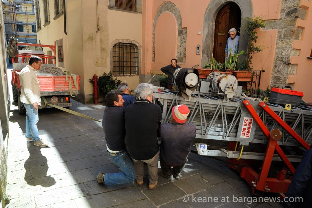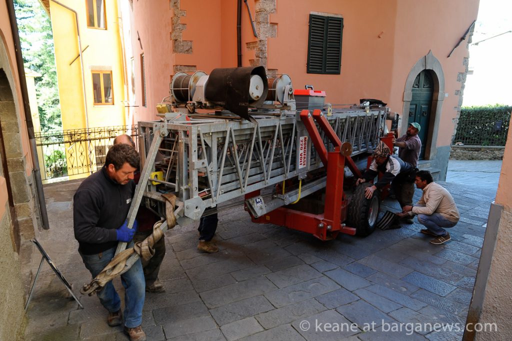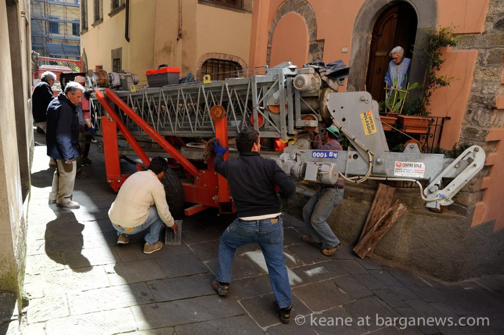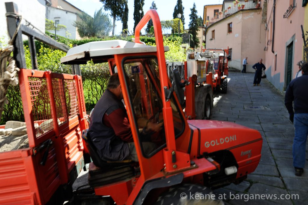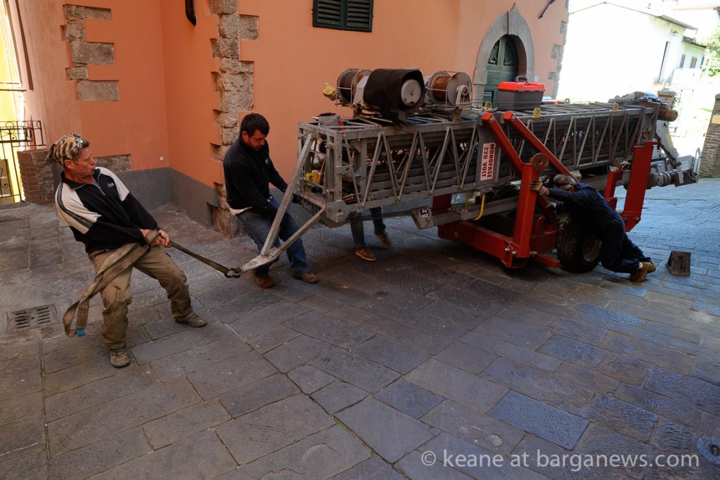 One tractor and trailer dragged the crane into Barga Vecchia past Porta Macchiaia but was proved useless as the extreme weight meant that even after filling the trailer with sand to put extra weight on the axle the tires lost their traction and slipped on the steep surface.