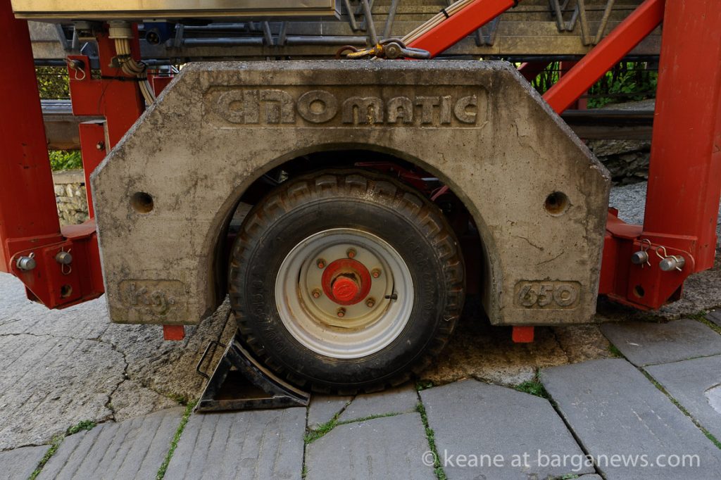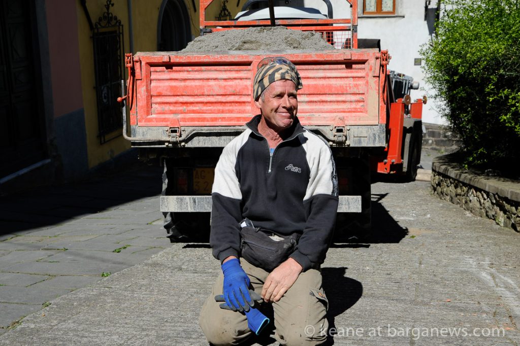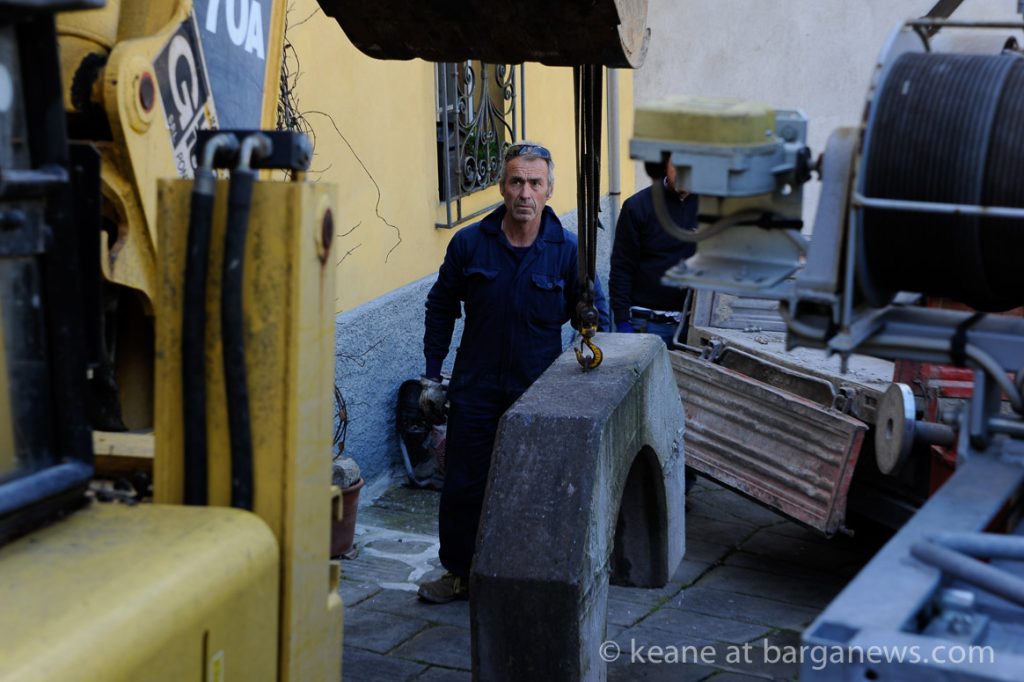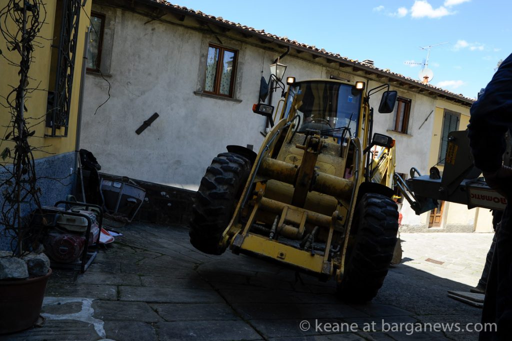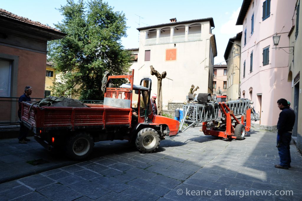 One tractor and trailer dragged the crane into Barga Vecchia past Porta Macchiaia but was proved useless as the extreme weight meant that even after filling the trailer with sand to put extra weight on the axle the tires lost their traction and slipped on the steep surface.