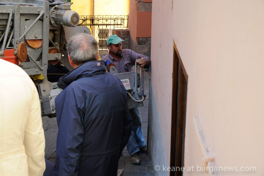 For most of the onlookers to todays event, the crane was just too long to even think about getting it into position in Piazza Sargentone. There were a couple of sharp bends in the road that could never be passed – what was needed according to most of the informed opinion was a helicopter or a miracle.