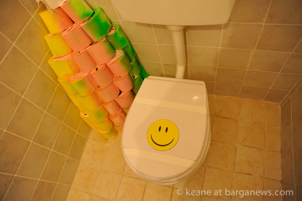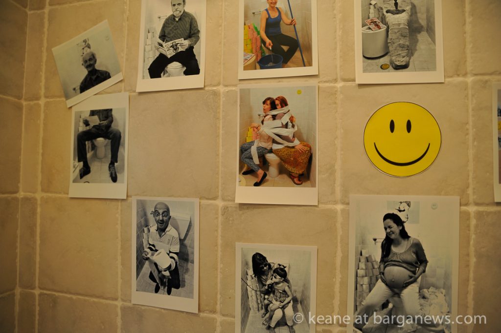 Within a sterile environment, an individual is photographed on the toilet, the photos on show are attached to the tiles on the walls, they “bare all” of what is, a very personal function, a private moment.