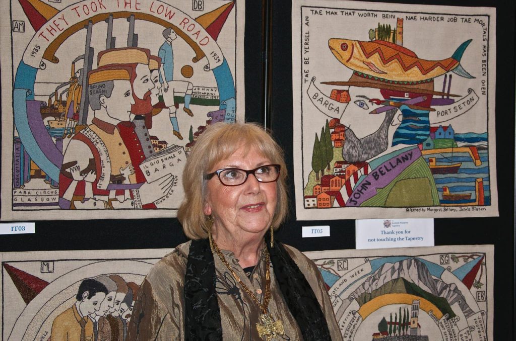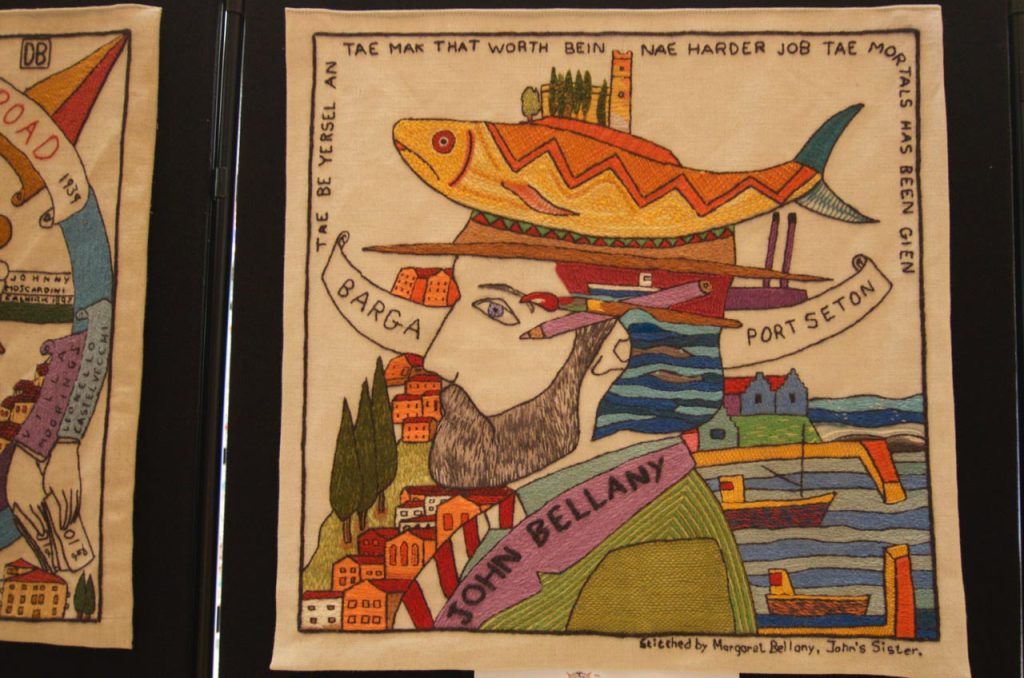 Included is a picture of Margaret Bellany (John’s sister) standing next to the panel of John she stitched.
