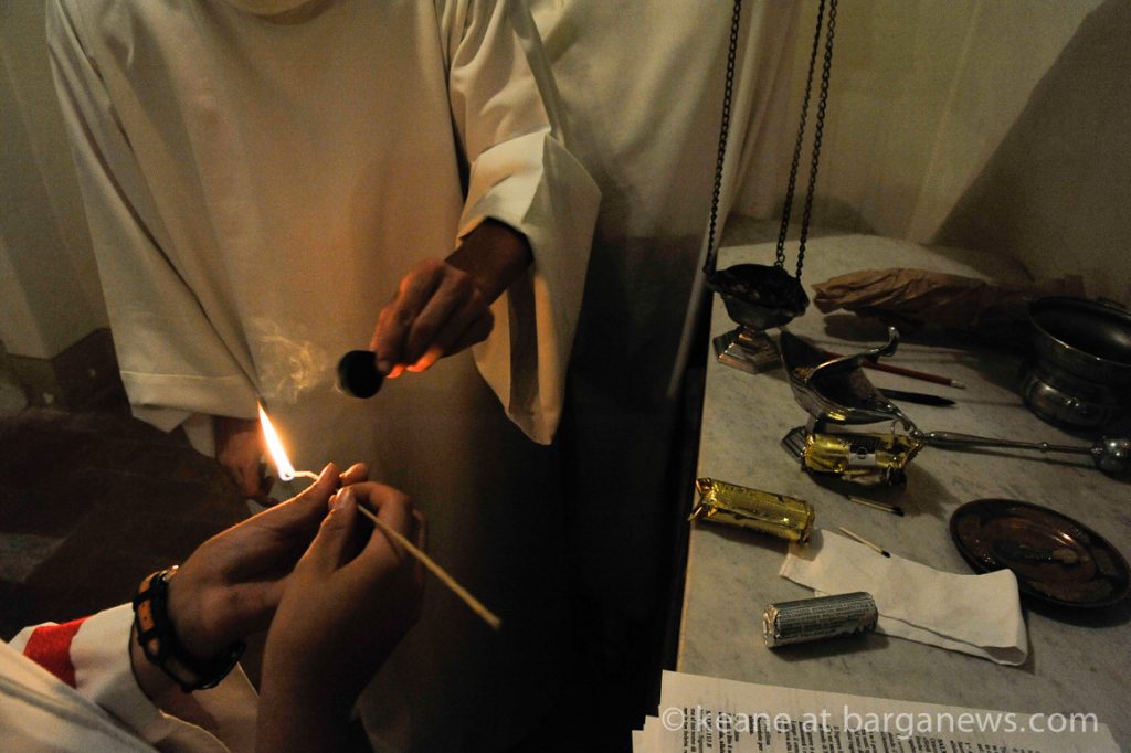Don Stefano’s voice is amplified through a loud speaker which is being carried aloft by a young man walking ten paces in front of him. All in all, a strange aural trick is taking place as this arrangement gives the impression that the young man is speaking. One wonders if he is tempted to mouth the words and join in the game?