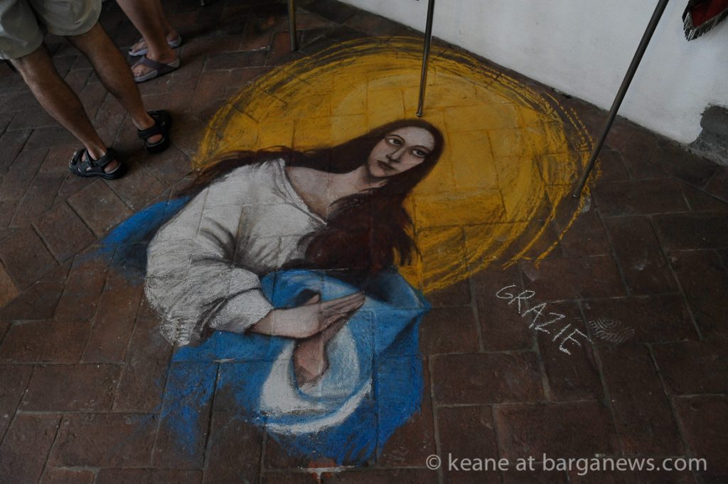 Seems like most of the town is lined up along the narrow streets watching the men struggle with their heavy load . As is usual at most Italian religious festivals, there is a healthy buzz of background noise of people greeting each other and even one or two guesses at how far out of the town stretch the waiting line of blocked cars.