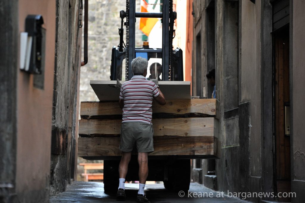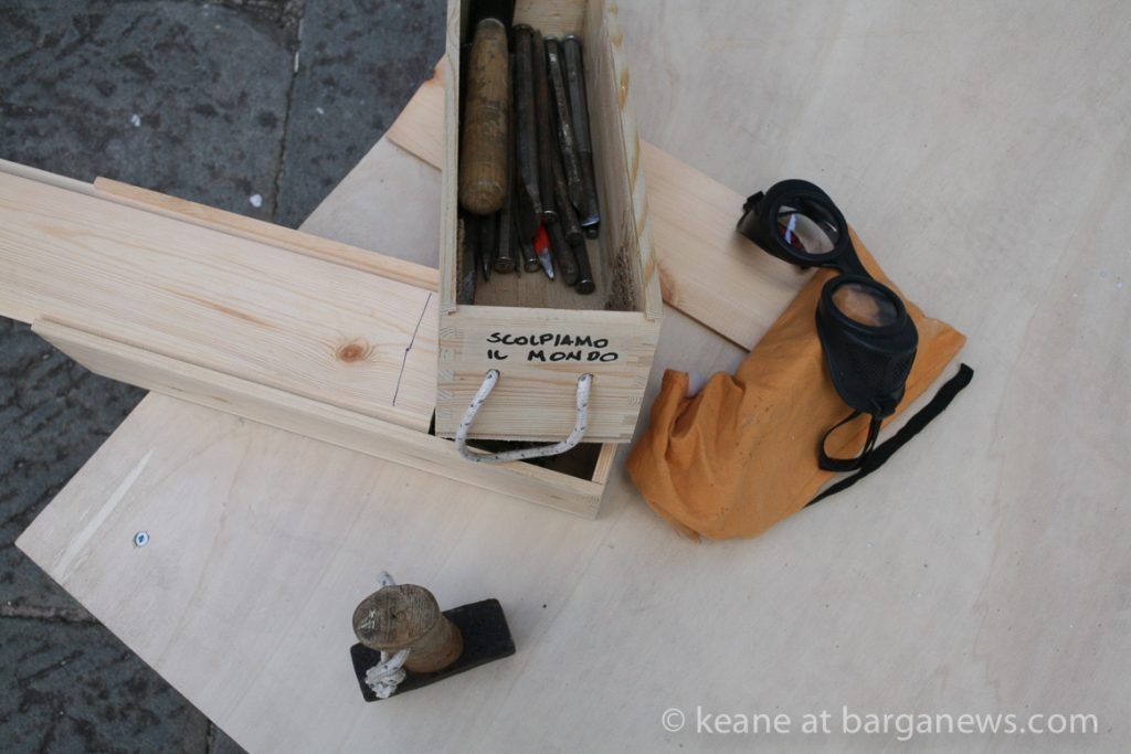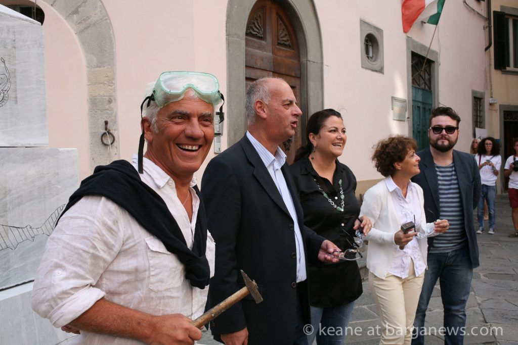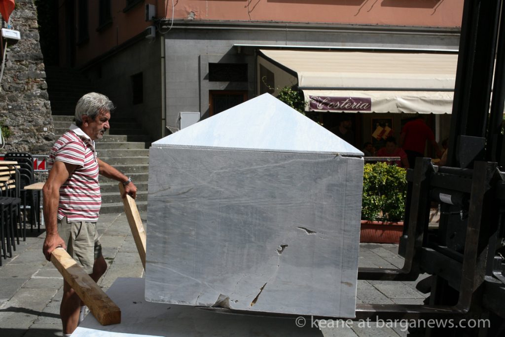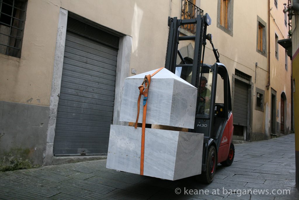 Three of those blocks of marble have now been transported into Piazza Angelio in Barga Vecchia and the Roman sculptor, Massimo Catalani has now started work chiselling into the marble.