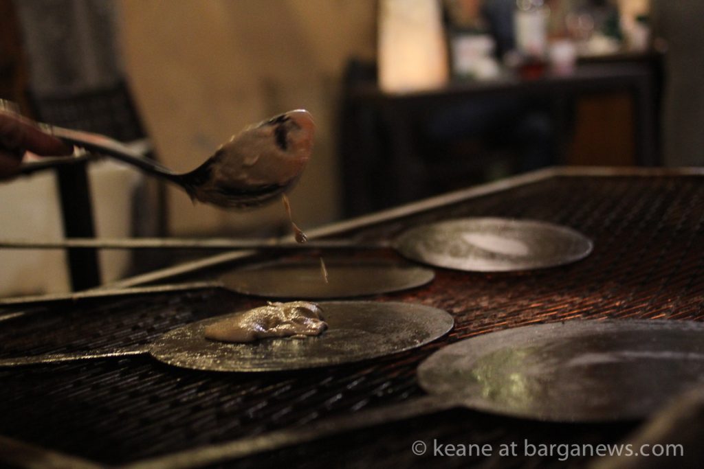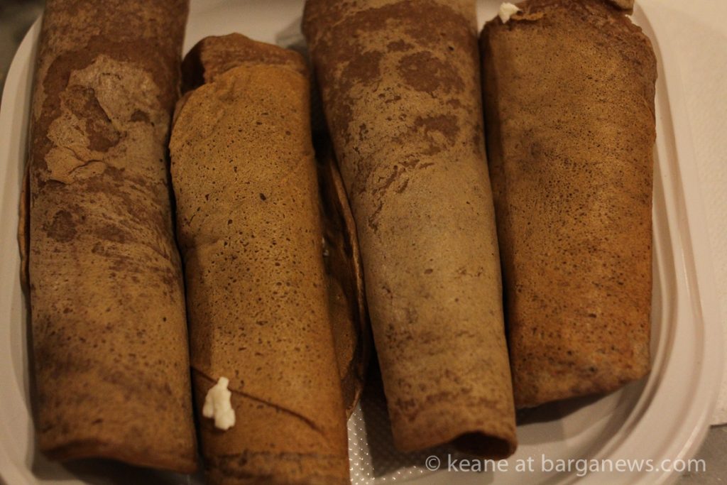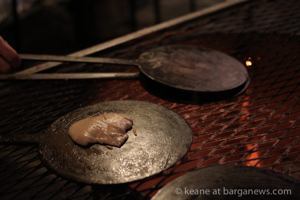 Necci …. sweet chestnut flour, water and salt mixed into a thick paste and cooked between two hot plates over a flame. Two metal plates, the testi or cotte, are oiled and heated and the chestnut paste is poured onto one of the plates, the other is placed over the top so that the necci can be cooked from both sides. A stick to press down on the top plate and in seconds you have one of the tastiest foods in this area (add some ricotta and you have quite simply the Food of Gods)