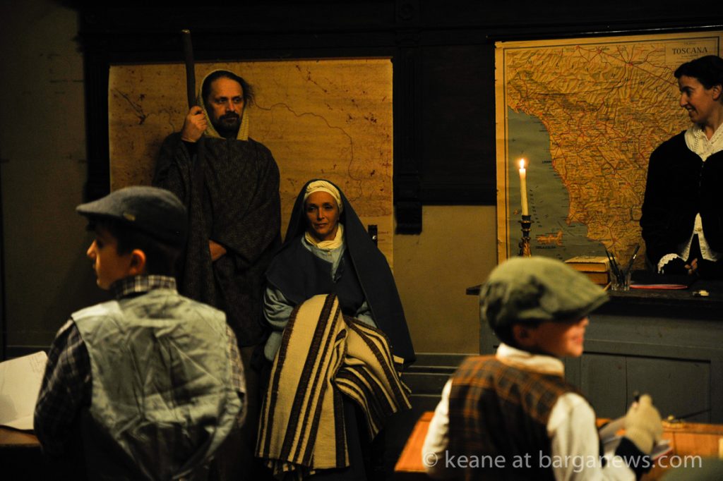 Looking at them the date should be somewhere around zero. The Roman centurions and census takers (speaking in Latin) would seem to confirm that date but just before Mary and Joseph and their donkey arrived in the census room, their first port of call was to a schoolroom with desks and chairs, pupils and a teacher all meticulously wearing clothes dating from probably the 1930′s. Outside of the school two guards stand both dressed as soldiers from the 16th century.