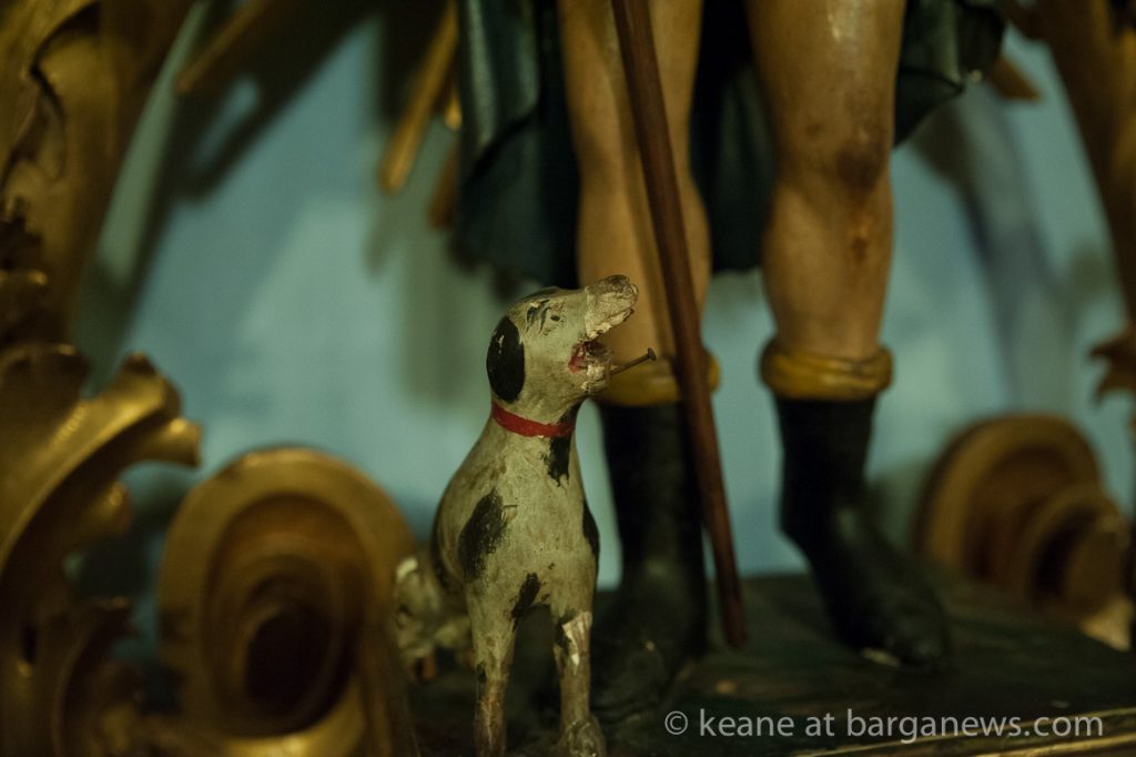 During his travels, he too contracted the plague which was evident by an open sore on his leg. Rocco was banished from the city and took refuge in a cave. There he slept on leaves and drank water from a small stream. Miraculously a dog that refused to eat, faithfully brought him bread as a means of sustenance. The dog used to leave a nearby castle and the lord of this castle having a curious nature followed this dog into the woods and discovered Rocco. The nobleman had pity on Rocco and brought him to his castle where Rocco was cured – source