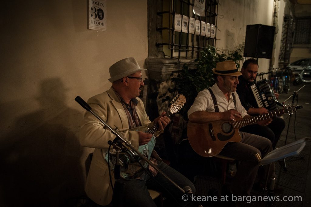 The Italian swing band, The Aristodemos were last night playing away from their home town of Barga and instead were further down that valley making themselves heard inside the walls of another medieval walled city – this time the city of Lucca.