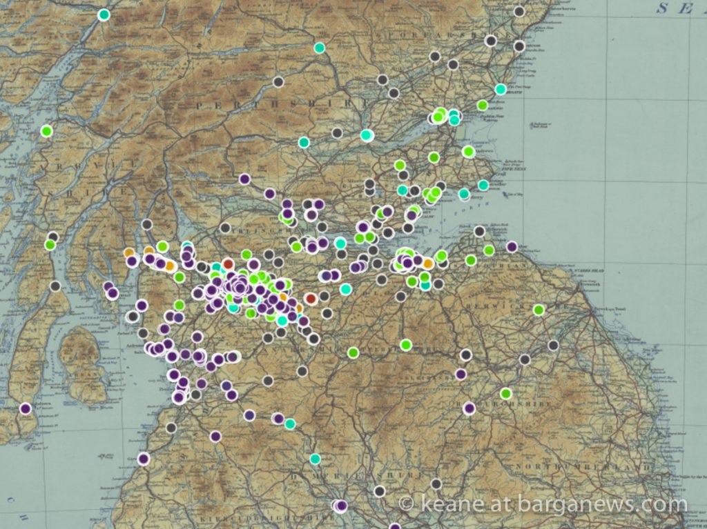 The base mapping depends on the scale and location and includes: Ordnance Survey, Map of Scotland (1927); Bartholomew’s Half Inch to the Mile Maps of Scotland, 1926-1935; Bartholomew’s Plan of the County of the City of Glasgow (1930-31); Bartholomew Post Office Plan of Edinburgh and Leith (1939-40).