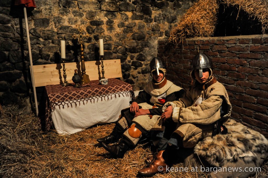 Looking at them the date should be somewhere around zero. The Roman centurions and census takers (speaking in Latin) would seem to confirm that date but just before Mary and Joseph and their donkey arrived in the census room, their first port of call was to a schoolroom with desks and chairs, pupils and a teacher all meticulously wearing clothes dating from probably the 1930′s. Outside of the school two guards stand both dressed as soldiers from the 16th century.