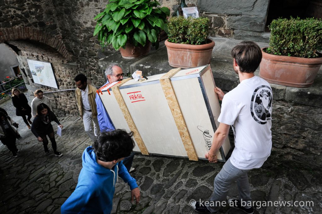 Luckily just as the interview was finishing, those two crates miraculously arrived by courier and the full contingent of work could finally get to be hung in the Palazzo Carli.