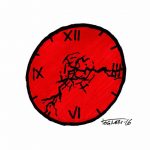 Lucia Morelli, invece, ricorda un’altra importante mostra dell’artista: “Il progetto “Venti d’Arte” è nato con Sergio. Me lo ricordo seduto sul divanetto rosso, al centro di una stanza dalle pareti incomplete e con la seconda mano ancora da stendere. Sul pavimento c’erano i barattoli di vernice aperti, con i pennelli ancora da pulire. Una pausa per definire le ultime cose prima dell’apertura di “ArteFact”, la collettiva di tre artisti: Sergio, Nicola Salotti e Keane (article here)  che avrebbe inaugurato i nuovi spazi di “Venti d’Arte”. Era il 2010. In quell’occasione Sergio esponeva le sue figure astratte, geometrie incalzanti che ricordano cieli stellati e mondi fantastici. L’inaugurazione andò benissimo, la gente non riusciva ad entrare dal grande afflusso. Dopo una quindicina di giorni organizzammo un evento di chiusura della mostra: un live painting con un’unica tela per tre artisti (article here)  Ne uscì un’opera summa, qualcosa che ancor oggi mi strabilia e profondamente mi tocca il cuore. Ogni qual volta osservo quella grande tela, rivedo gli occhi illuminati da una particolarissima luce radiosa di Sergio e tutta la bellezza della sua grande anima”.