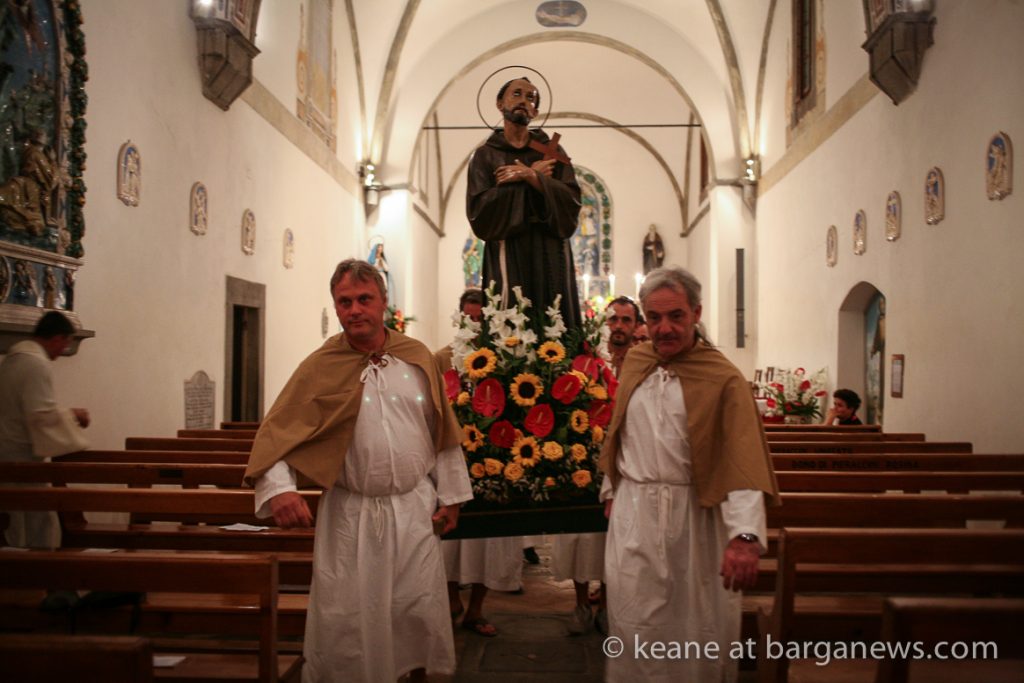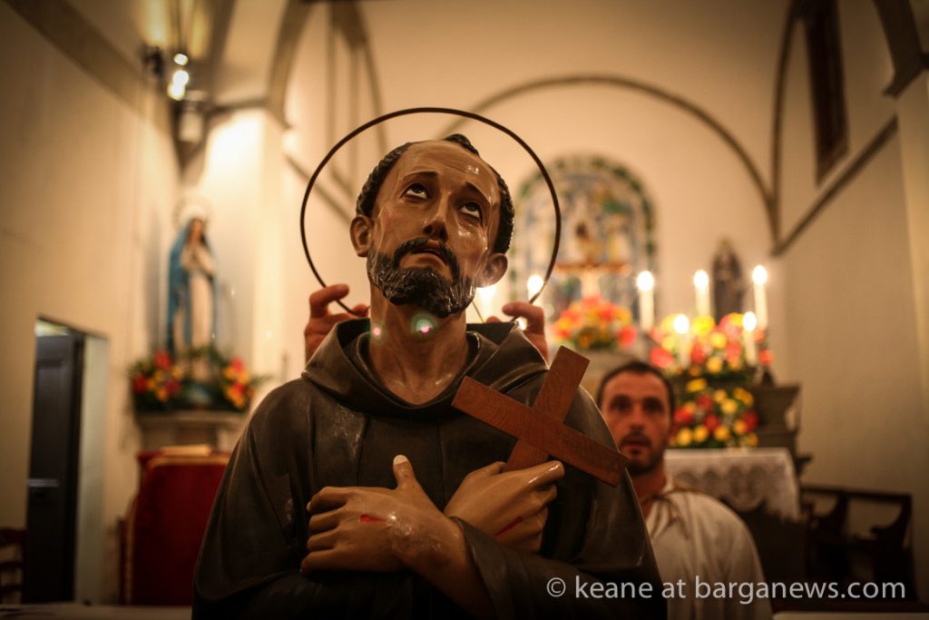 It’s 9.30 on a hot and sticky August night in Barga. The temperature has been up in the high 30s all day and it feels like its still climbing. Four men are carrying a heavy wooden statue of St. Francesco along the streets on their shoulders. They are following the local priest who is struggling to keep ahead of the local 30 piece band.