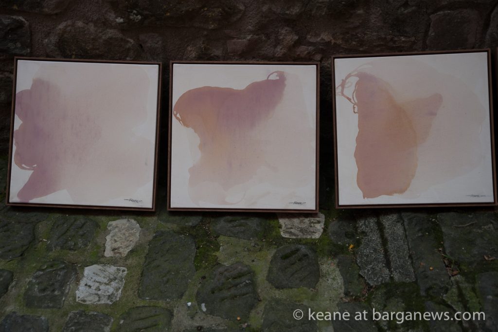 He has just completed a series of work which attempts to recreate that unhappy/happy accident using red wine in place of the paint and and a series of square blank canvases instead of the white tablecloth.