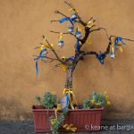 Easter Monday with bright spring sunshine in the piazzas of Barga Vecchia with large crowds moving through the city.