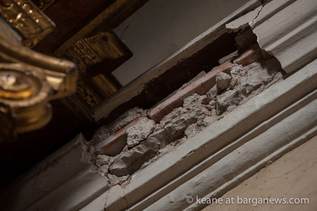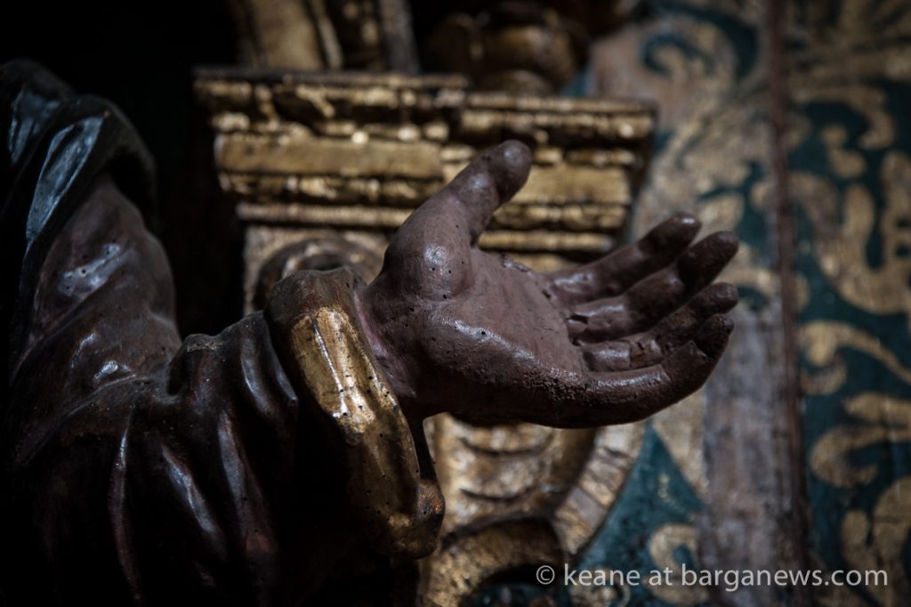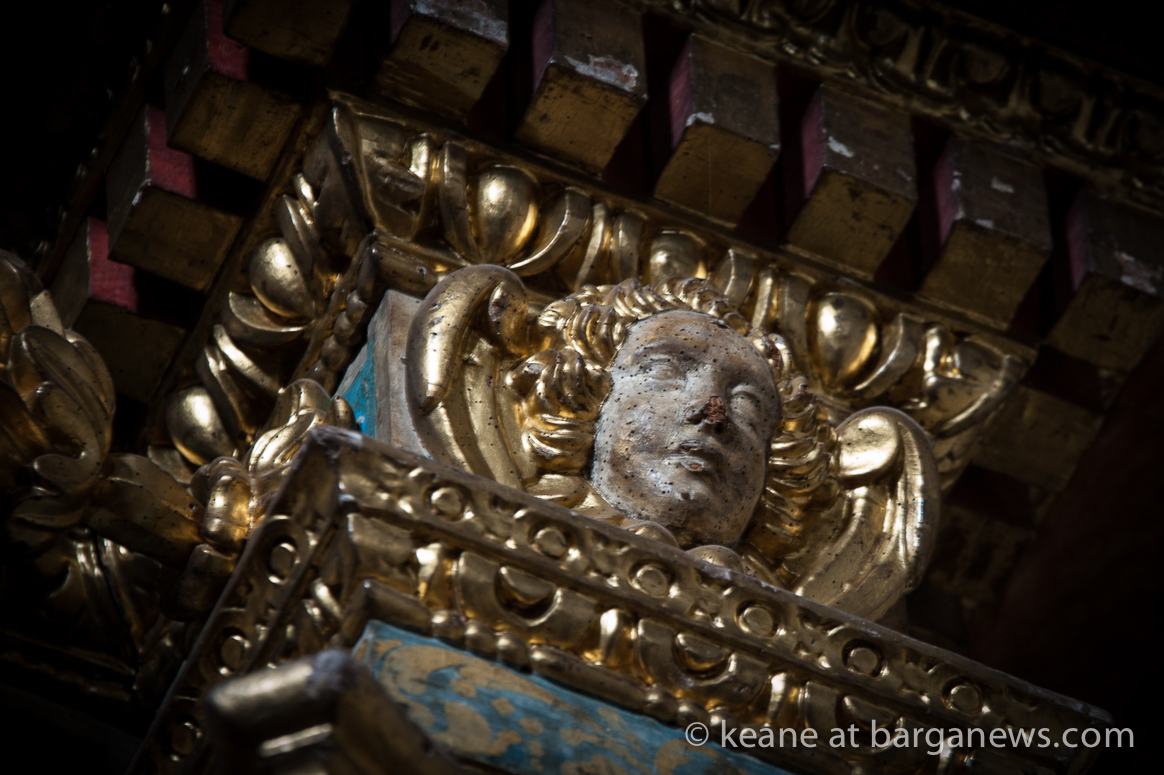 Since then the area where the angels faces were once situated are still showing just broken and splintered wood but there is probably a more damaging and insidious process taking place further up towards the ceiling of the church as the golden wood altar built by Francesco Santini of Cerreto, dating from 1646 is beginning to show signs of its venerable age.
