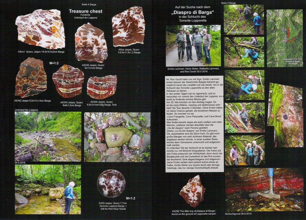Jervis (1881) describes the precise locality, geological context, and the famous use of the Barga jasper in the chapel of the Princes in the Church of San Lorenzo in Florence. – source – Oxford University Museum of Natural HistoryDiaspro di Barga. Purplish ground with gleaming white veins. The columns in the Borghese Chapel in S. Maria Maggiore are veneered with this stone. (Very rare).