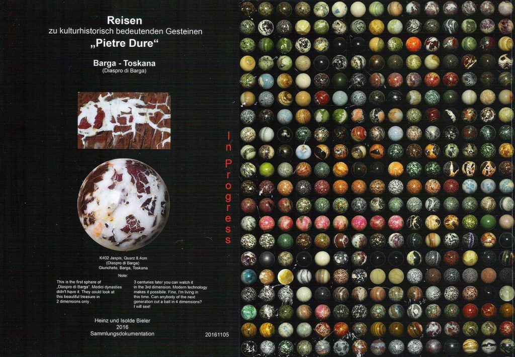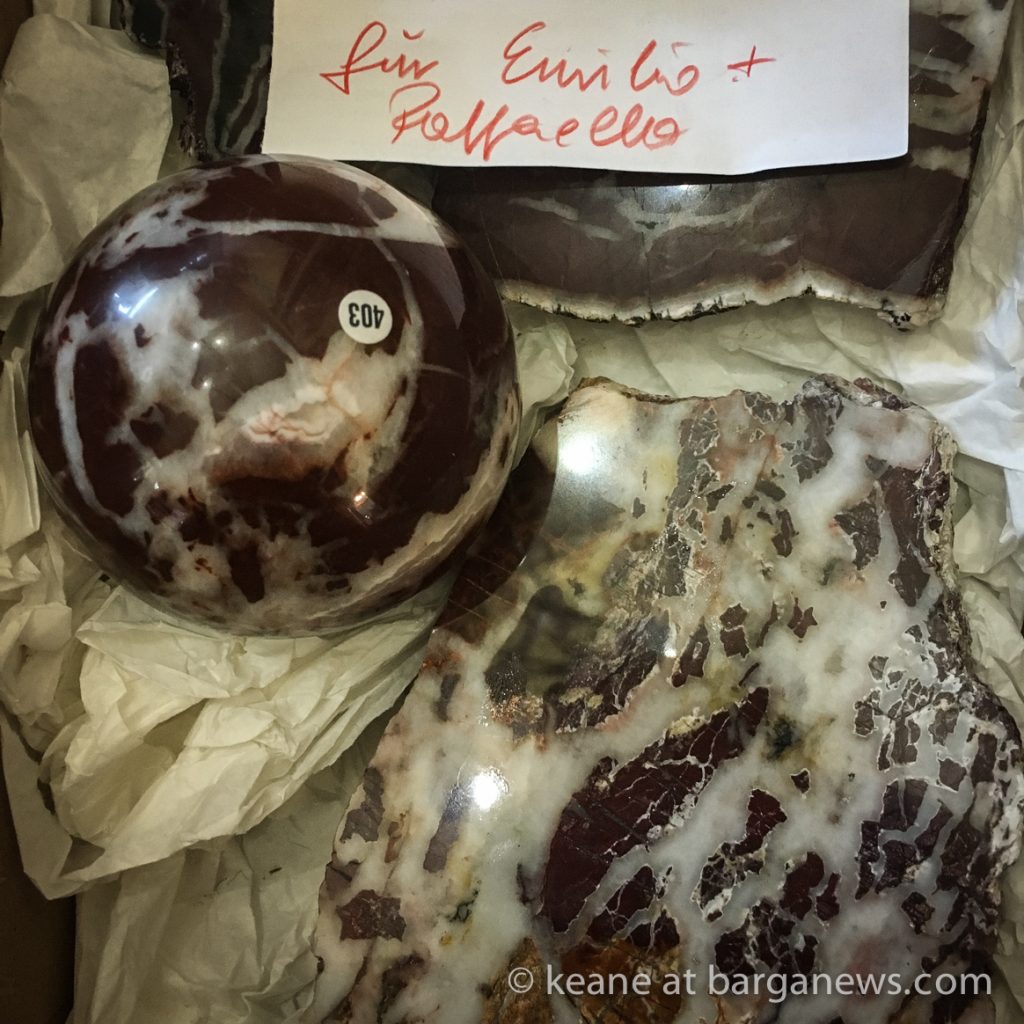 He uses a technique of sculpting the rocks into a round ball, which is then ground down into a perfect sphere of around 8 cms diameter. Some of those spheres can be seen here in his gallery