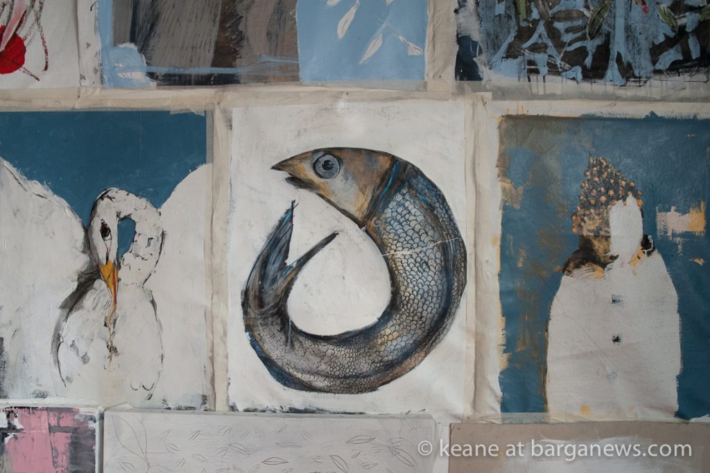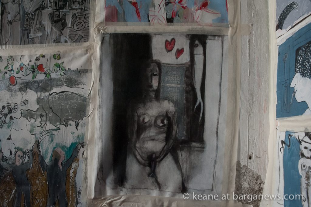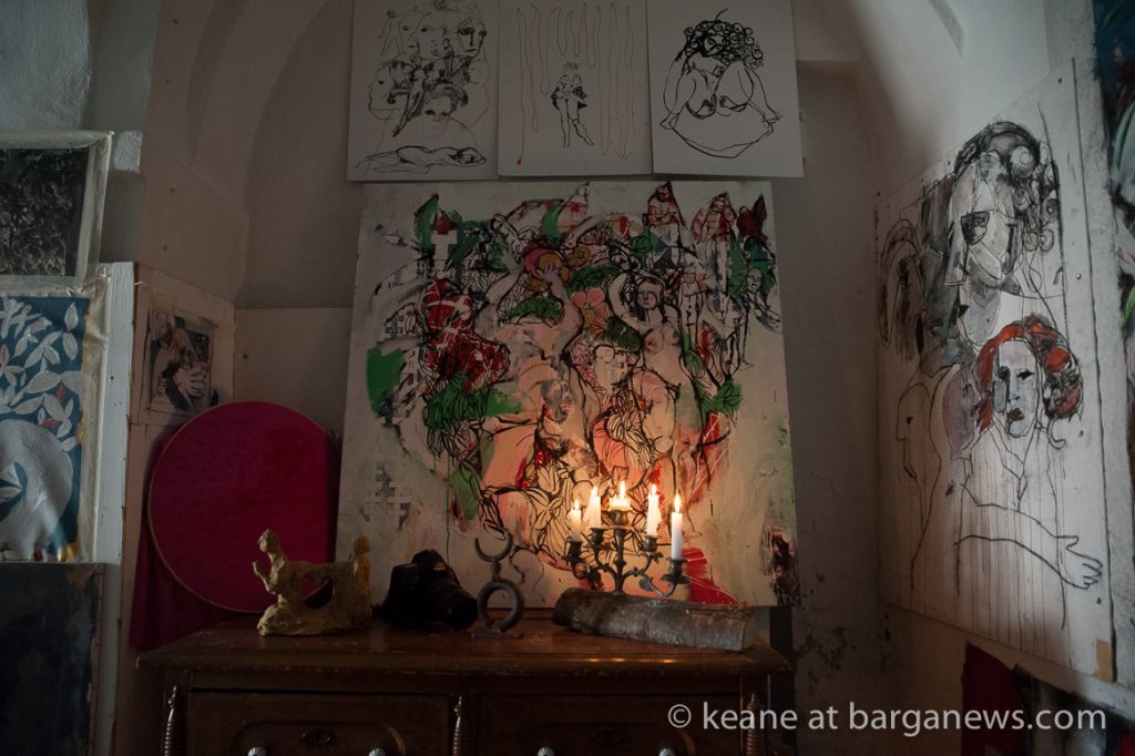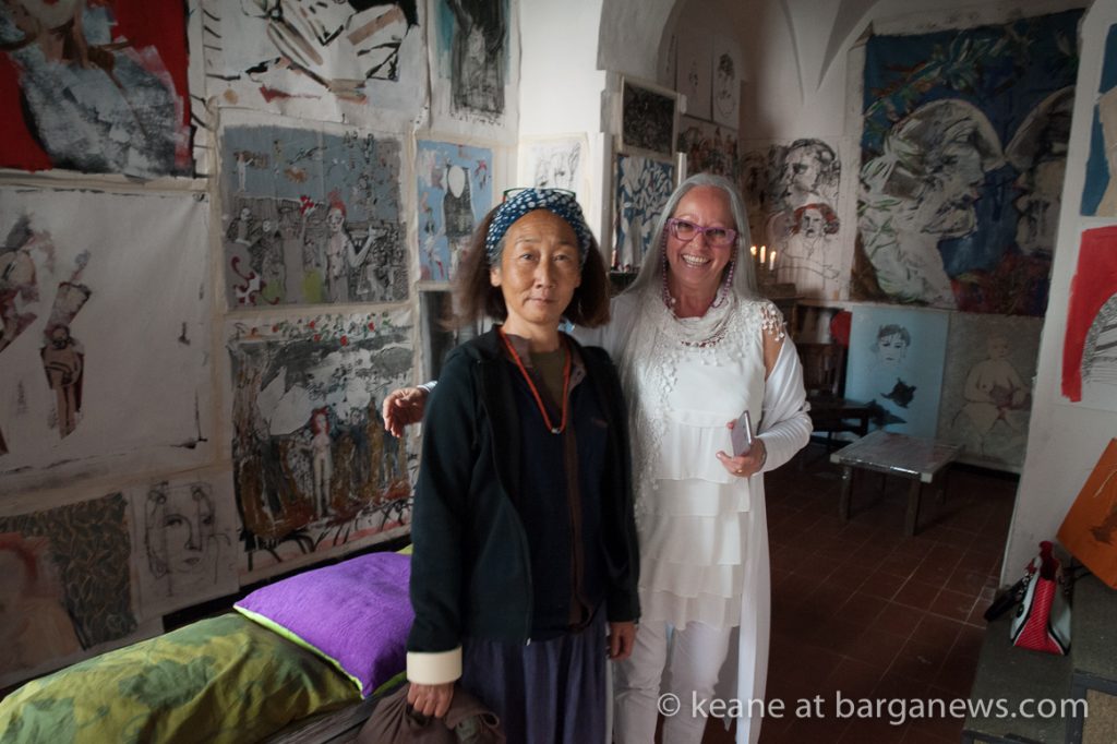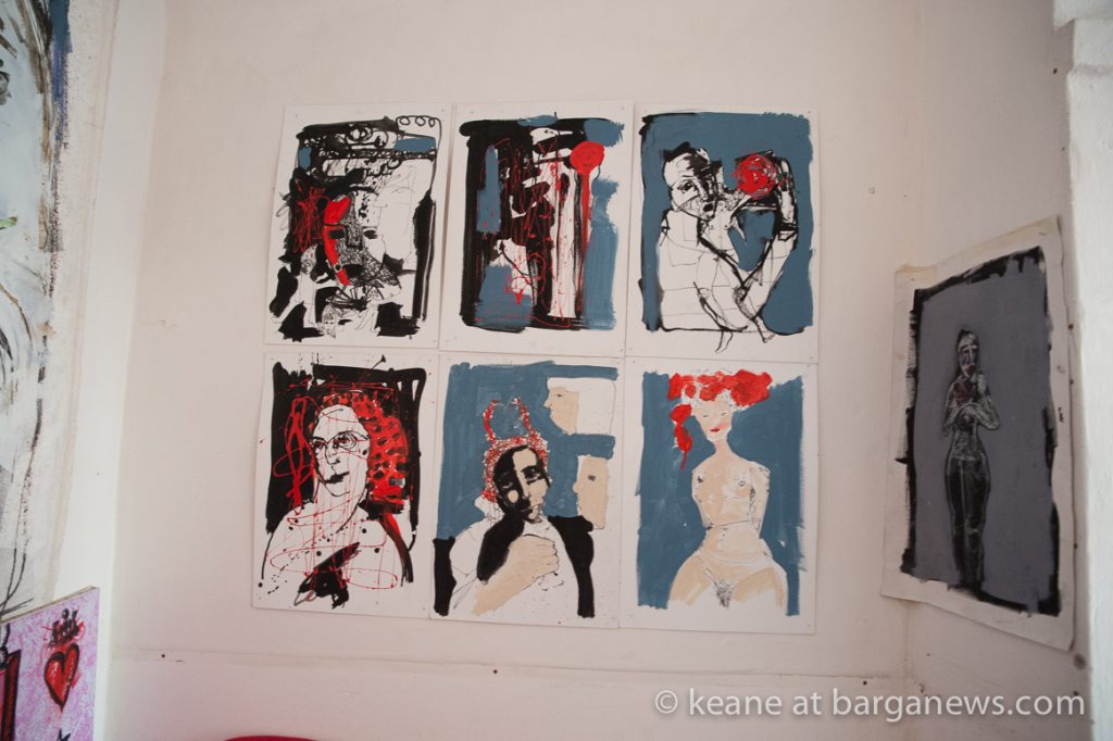 “Scampoli,” an exhibition of works by the remarkable painter Giorgia Madiai now underway in Barga Vecchia, is a mesmerizing inquiry into the most volatile realm of human interaction: speech itself. To walk into Madiai’s studio in Via Pretorio, the mostra’s setting, is to be carried along on a silent yet deafening tsunami of shouts and whimpers, songs and sighs, moving eloquence and disturbing cacophony. It is silent only in the literal and least interesting sense, because the shouters and sighers are graphic images that cover every square meter of the studio walls — and the sound we hear is a testament to the suggestive power of art.