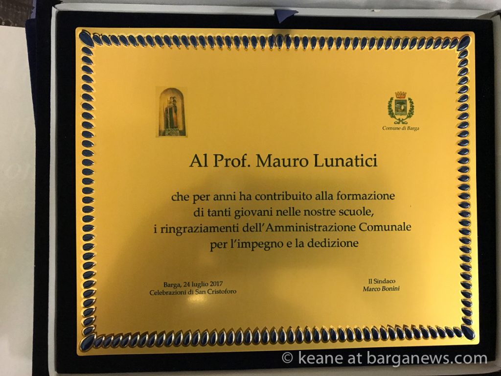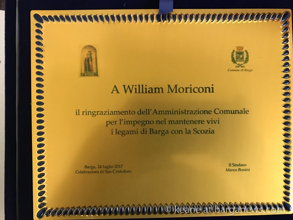 Saranno anche altri i riconoscimenti importanti. Due targhe saranno consegnate una al professor Mauro Lunatici e l’altra a William Moriconi. L’Amministrazione Comunale vuole infatti ringraziare Lunatici per l’impegno nelle scuole di Barga, che ha contribuito a far crescere, e per la preziosa e fattiva collaborazione con il Comune che in tante occasioni, in questi anni, ha sempre potuto contare sul suo valido contributo. La targa a Moriconi invece verrà consegnata come ringraziamento per il suo impegno e per il prezioso lavoro nel sostenere il legame di Barga con la Comunità Scozzese.
