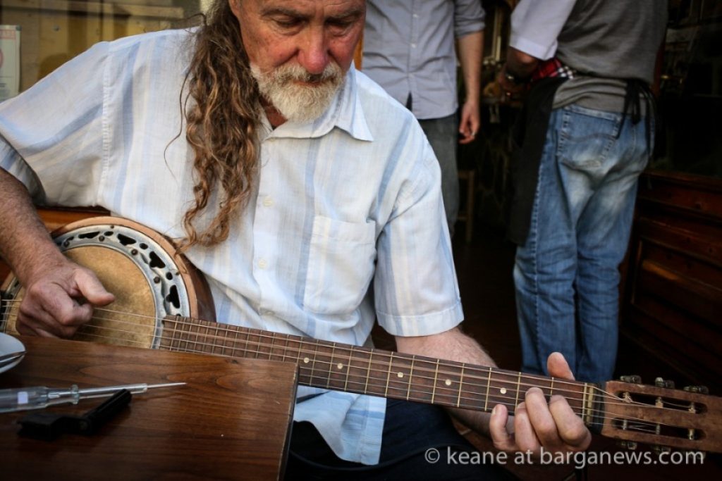 His daughter, Ellen was here in the city taking part in searching for the elusive cultural geocache boxes hidden around the area (article here) – Ian instead positioned himself at the unofficial cultural centre of Barga – the Da Aristos bar and using one the guitars hanging up on the wall, kept the clients entertained with a series of lively songs and stories interspersed with his wry sense of observational humour.