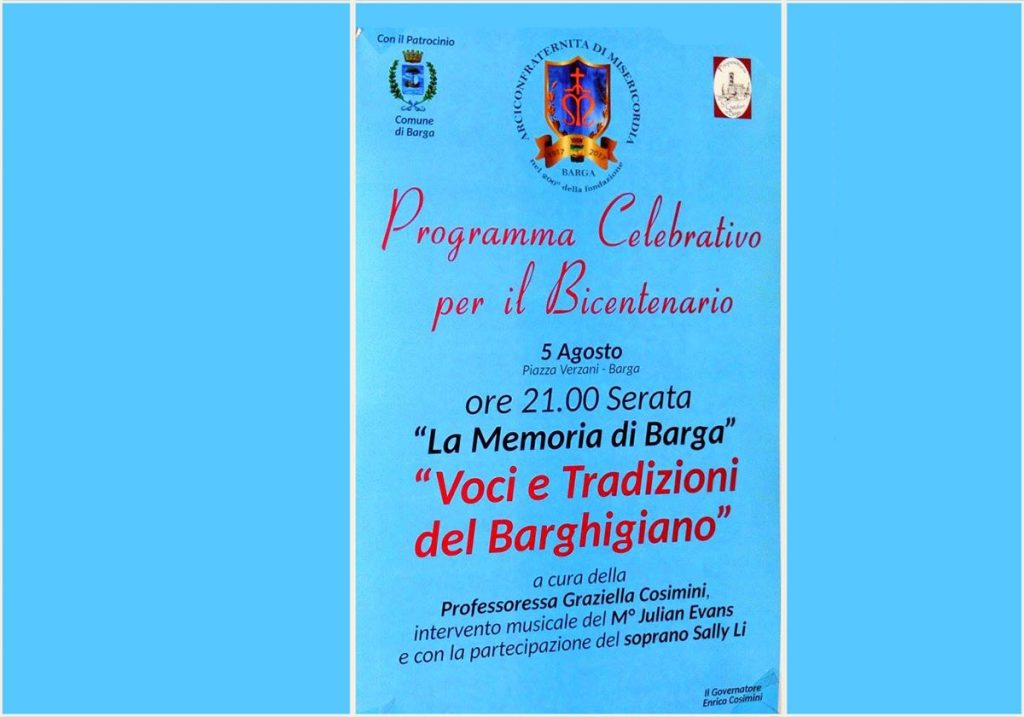 Voci e Tradizioni del Barghigiano As part of the celebrations for the 200 years of the founding of the Arciconfraternita di Misericordia in Barga, an evening in Piazza Verzani in Barga Vecchia entitled “The Memory of Barga” – Voices and traditions Barghigiano with Graziella Cosimini PREV NEXT Leave a Comment Cancel ReplyYou must be logged in to post a comment.