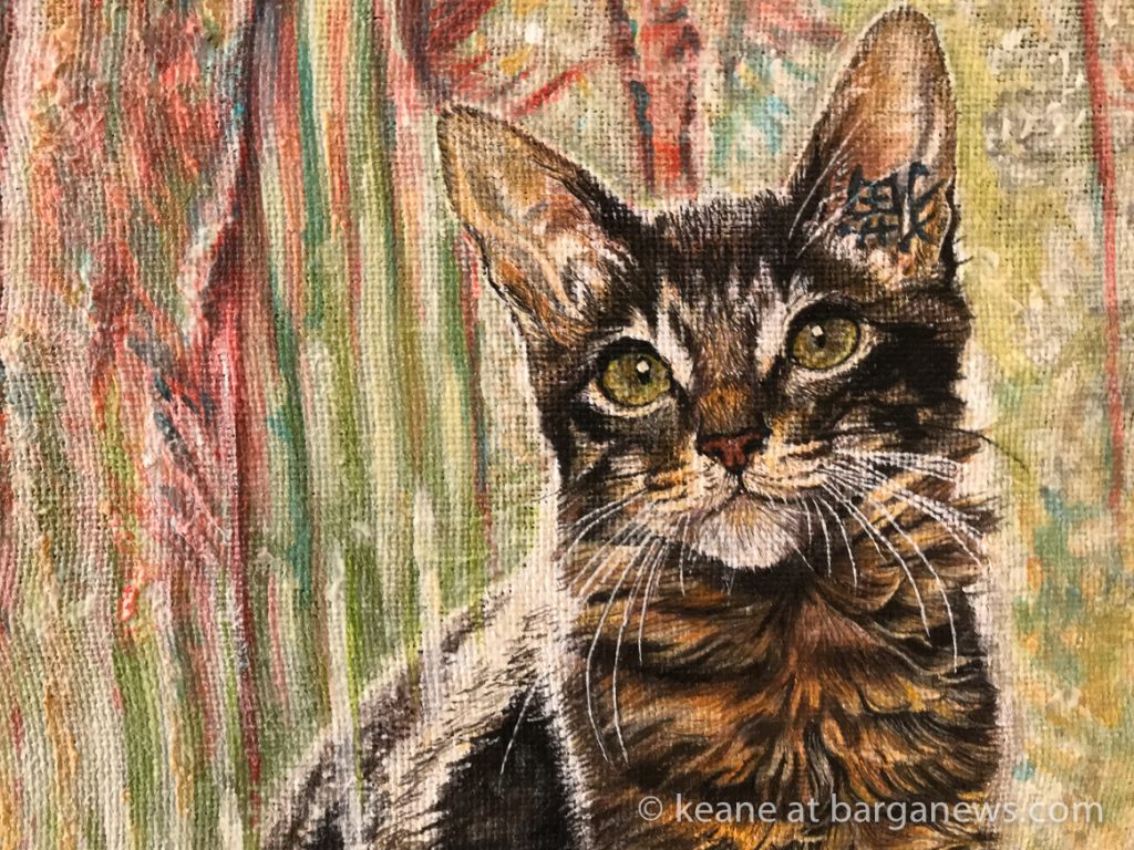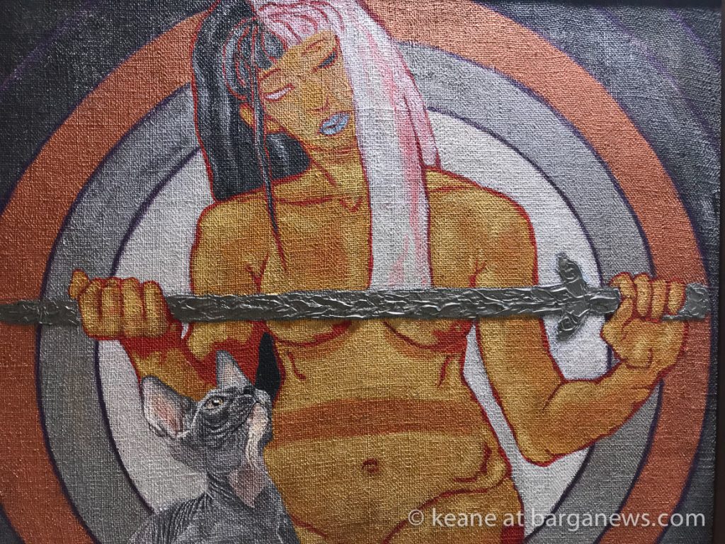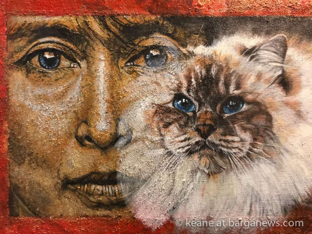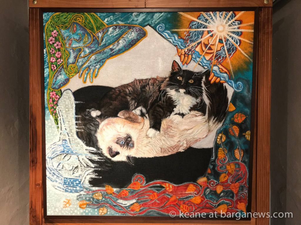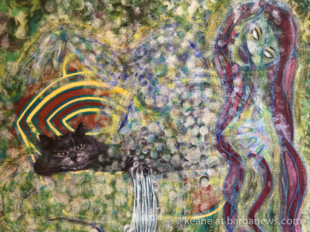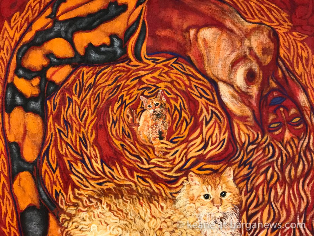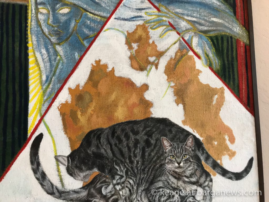 Agli elementi, graficamente rappresentati in maniera espressionista, da me preferita, sono accostate immagini di svariate specie di gatti, ritratti a trompe l’oeil (iperrealistici), che creano l’illusione di gatti reali entrati fisicamente nel quadro, in virtù della loro capacità di viaggiare tra le varie sfere dell’esistenza.L’ambiente stesso del dipinto si fa allora senziente della loro presenza e fra i gatti ed i daimon delle superfici dipinte si viene a creare un rapporto di reciproca interazione fisica e di intimo discorso intellettuale.