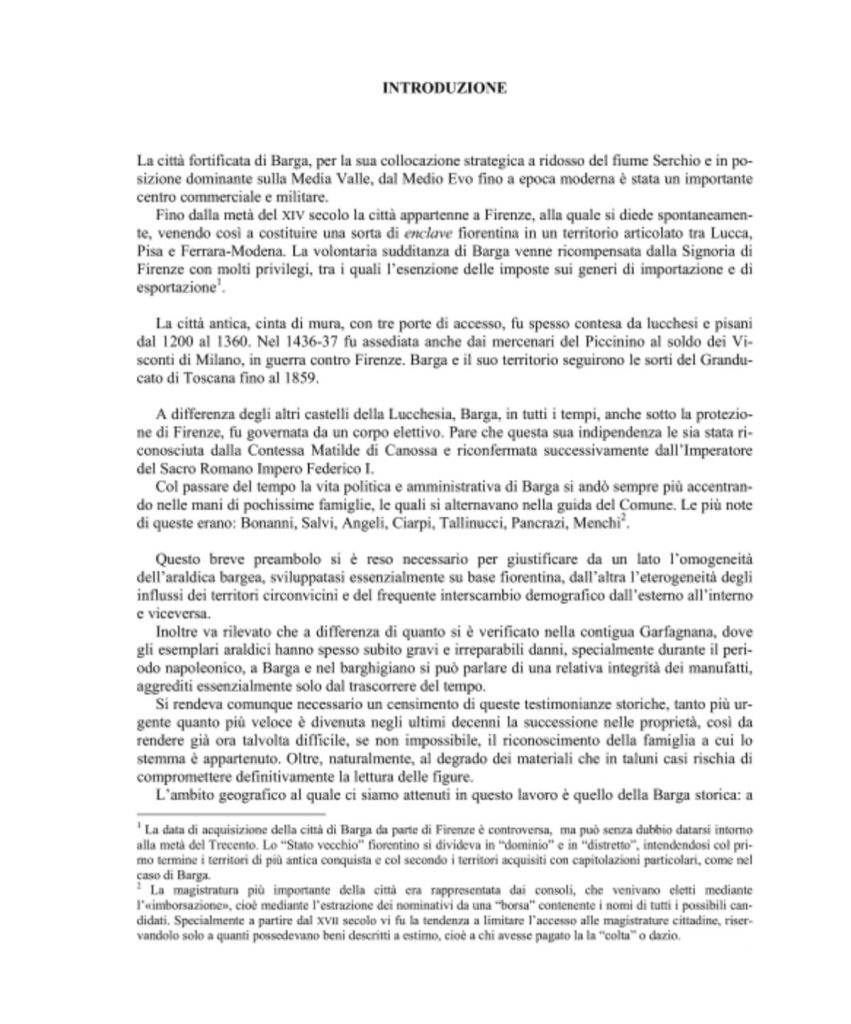 La città di Barga e il suo territorio, sono luoghi ricchi di testimonianze araldiche, dovute non solo all’appartenenza della città a Firenze, per diversi secoli, ma anche per l’attitudine, diffusa un po’ ovunque nella Valle del Serchio, di contrassegnare il proprio cognome, il proprio casato, con un simbolo ideografico, realizzato per lo più secondo i precisi canoni araldici.