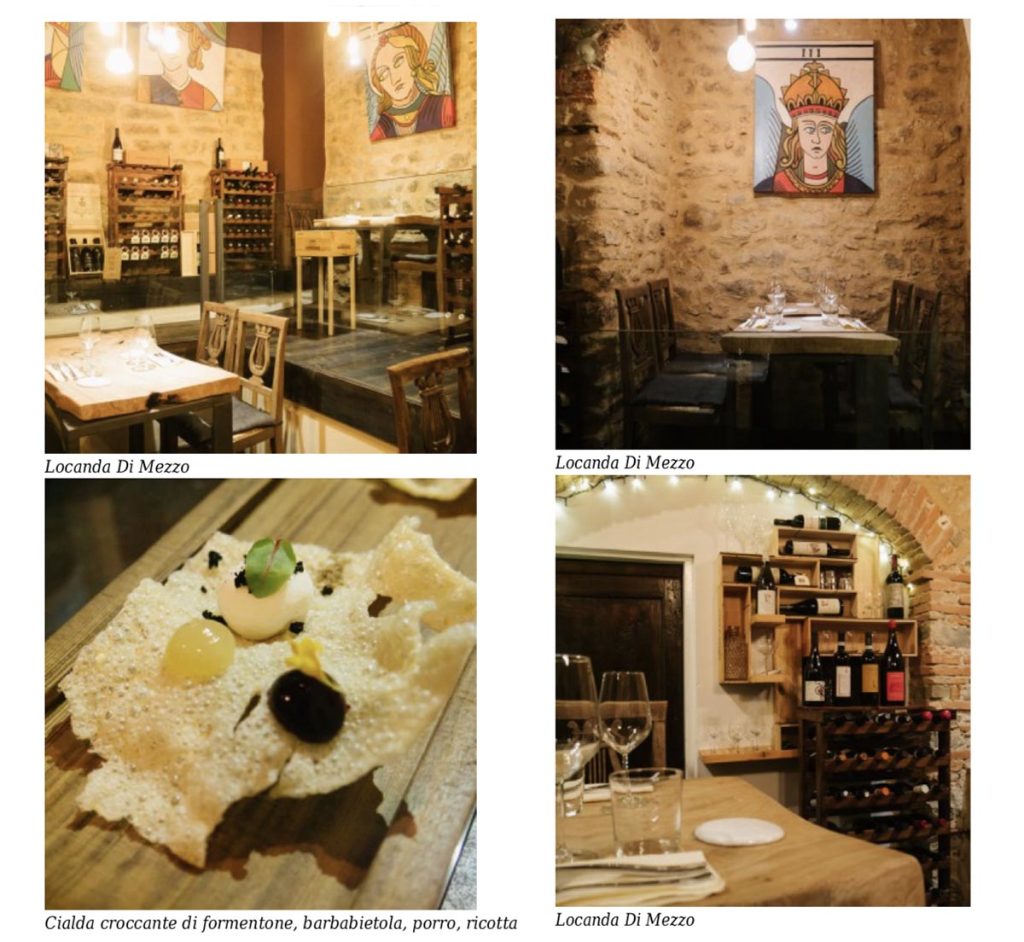Affacciata sulla prima piazzetta che si incontra all’ingresso di Barga, uno dei borghi più belli d’Italia, la Locanda di mezzo è un prezioso laboratorio di elaborazioni di materie che raccontano la geografia della Media Valle del Serchio e della Garfagnana. In questo settecentesco palazzo, Francesco Piacentini, giovane chef, originario del borghetto sopra Lucca, e Giulio Turriani, responsabile di sala, hanno deciso di fondere la loro voglia di narrare questo territorio attraverso la lavorazione quasi esclusiva di quello che offre. Alla base di tutto le idee, che hanno l’onere di fornire contemporaneità a ingredienti e piatti usciti da ricettari d’antan, rappresentate nell’emblema della Locanda con una lampadina dai filamenti che disegnano una forchetta. Ad una sala molto raccolta, che accoglie non più di venti persone, si è aggiunto da poco un ulteriore spazio per altrettanti coperti. Un suggestivo caveau in cui le pietre a vista delle pareti accolgono, al momento della nostra visita, le tele dei tarocchi di Keane, artista e fotografo, che ha realizzato una versione pop delle enigmatiche carte.