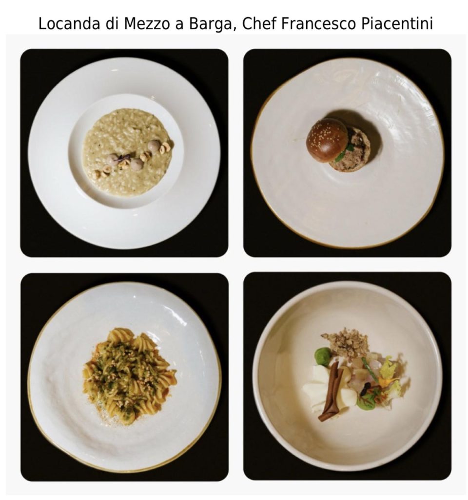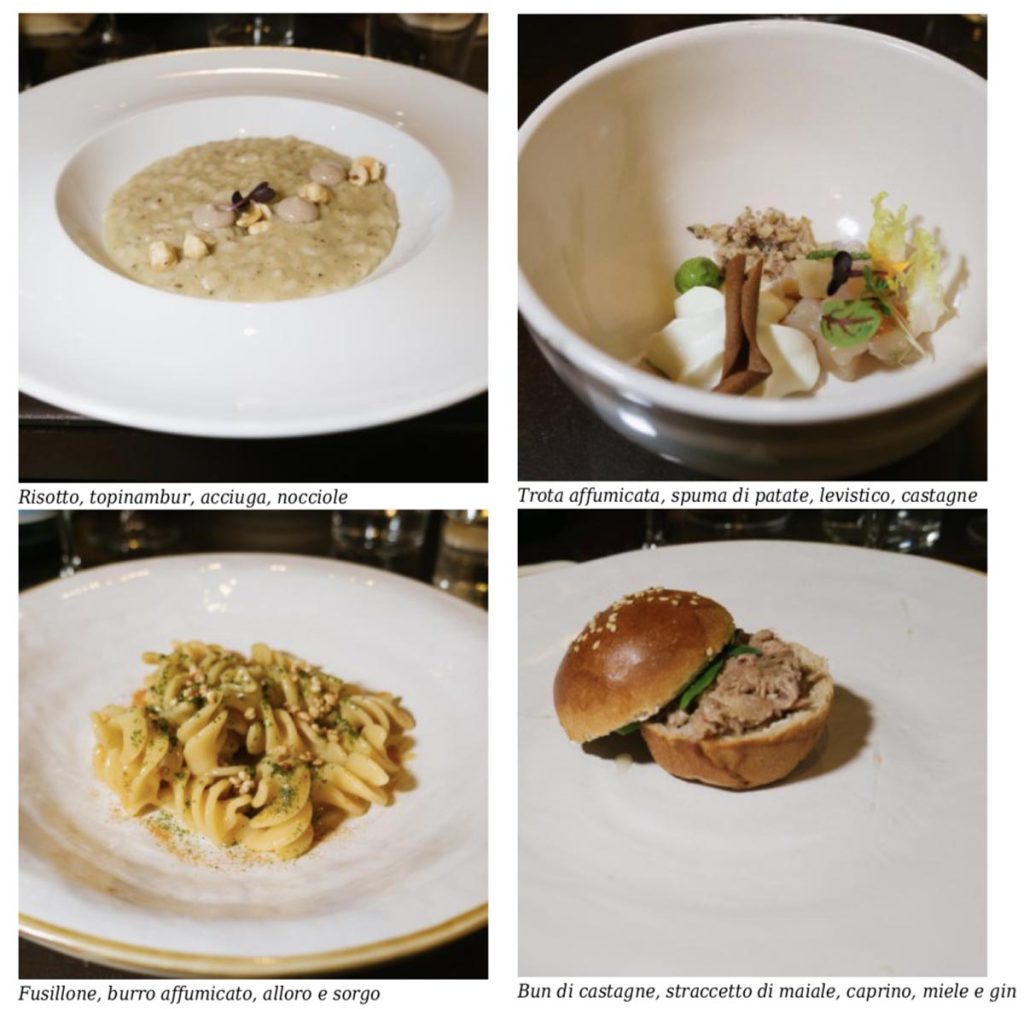“Polenta e ossi”, polenta di farina di castagne e stinco di maiale stracotto, una delle ricette più antiche della Garfagnana è ricodificata mantenendo i due elementi principali. Cuocendo lo stinco a bassa temperatura per 16 ore a 60° e trasformandolo in straccetti, poi leggermente marinati alla soia. Realizzando un bun con farina di castagne, farcendolo con il maiale, caprino e una soluzione di miele e gin.
