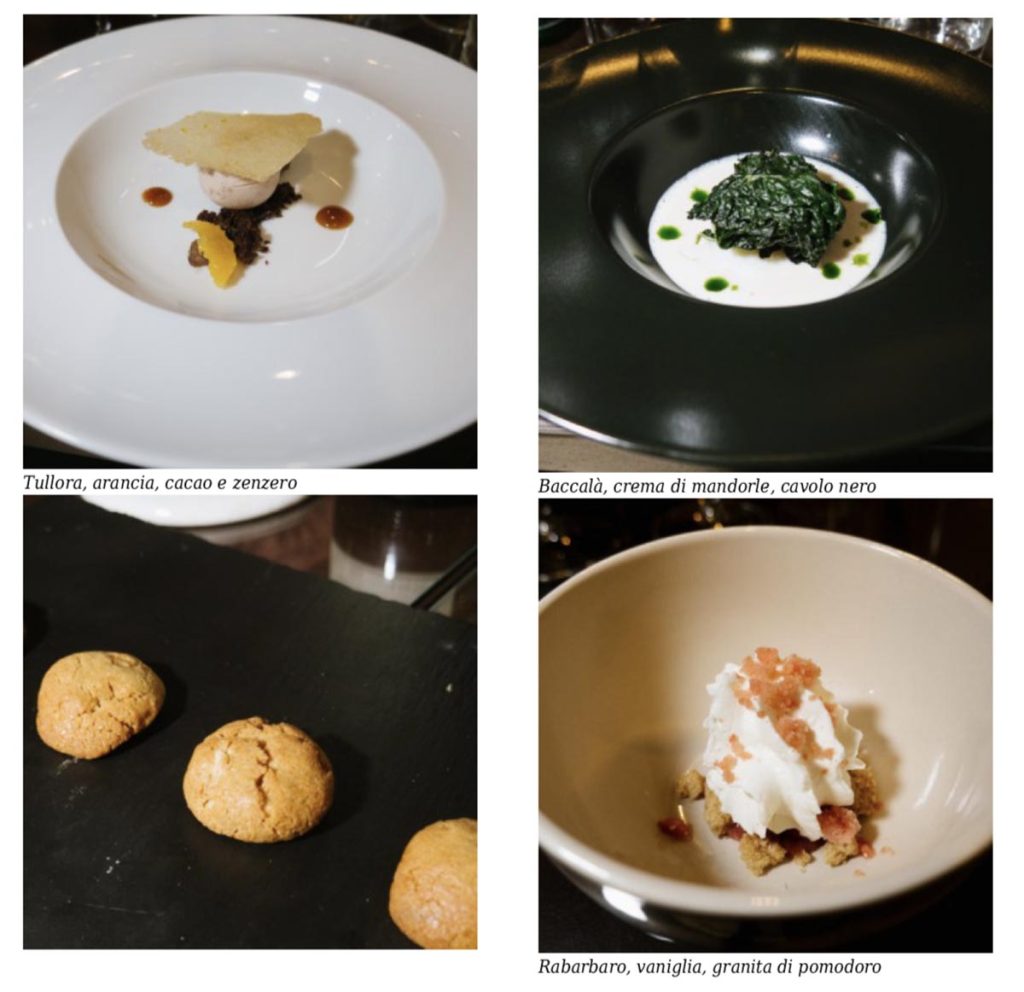 Chiude quella che un tempo era chiamata la “colazione del campione”, la Tullora, castagne secche ammollate nel latte, a cui pochi si potevano permettere di aggiungere la panna. Qui dalla castagna essiccata cotta nel latte viene ricava una mousse, abbinata a una granella di cacao amaro, aggiustando in acidità con arancia in tre versioni: a vivo, in riduzione e cialda.
