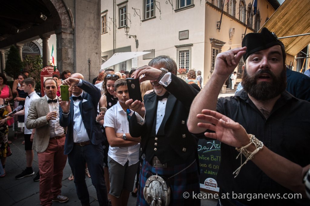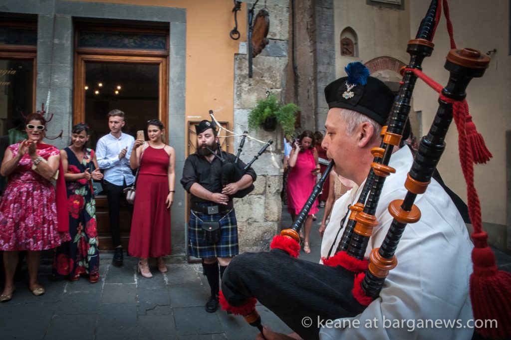 Many kilts, temperatures in the mid 30’s, bright sunshine, the sound of bottles of prosecco corks popping and launching into the blue sky, the swirling sound of bagpipes set against the background sound of the centuries old bells of the Duomo chiming out over the city …. yes, it was a normal July day in Barga Vecchia as the decades long Barga – Scotland connection was once more in evidence.