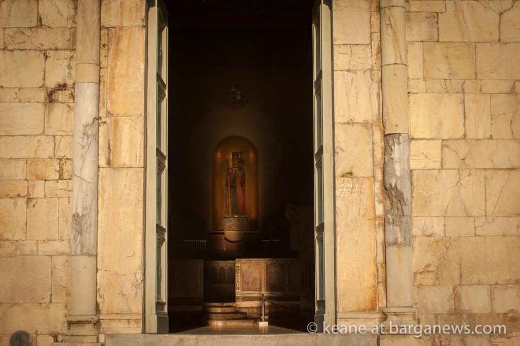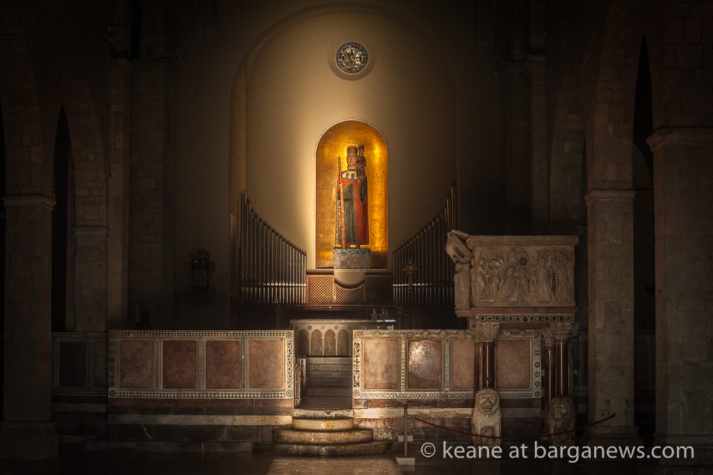 If conditions are right as the sun passes through the open door of the Duomo, it shines right down to the far end and lights up the enormous wooden statue of the saint, which then glows in the darkened space of the Cathedral.