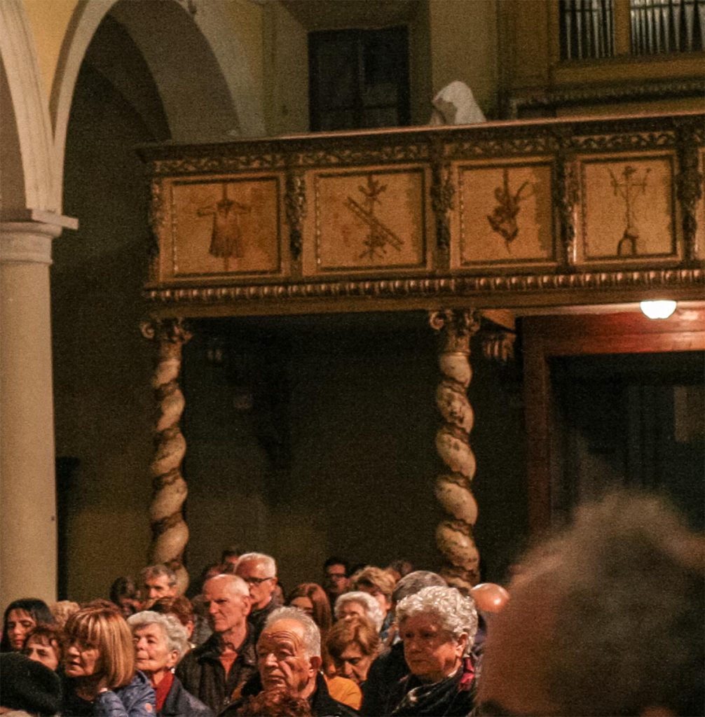 A ghostly white figure with a white shroud covering the head stood immobile on the balcony right through the conclusion of the Via Crucis – stations of the cross in the 15th-century Santissimo Crocifisso Church.