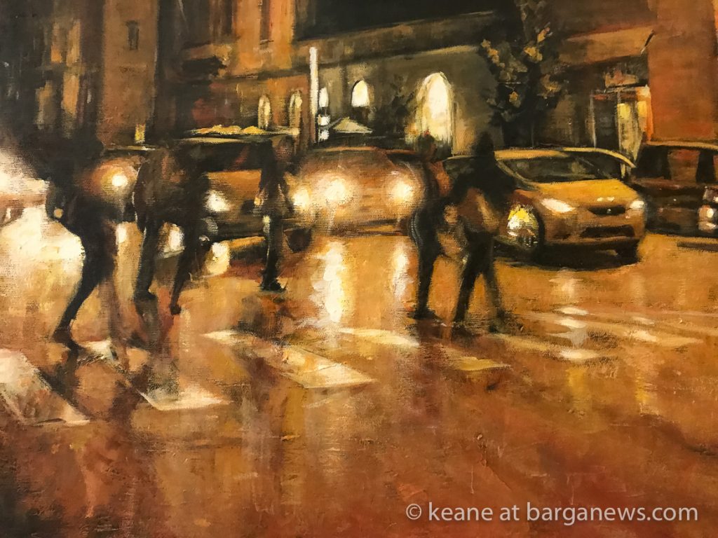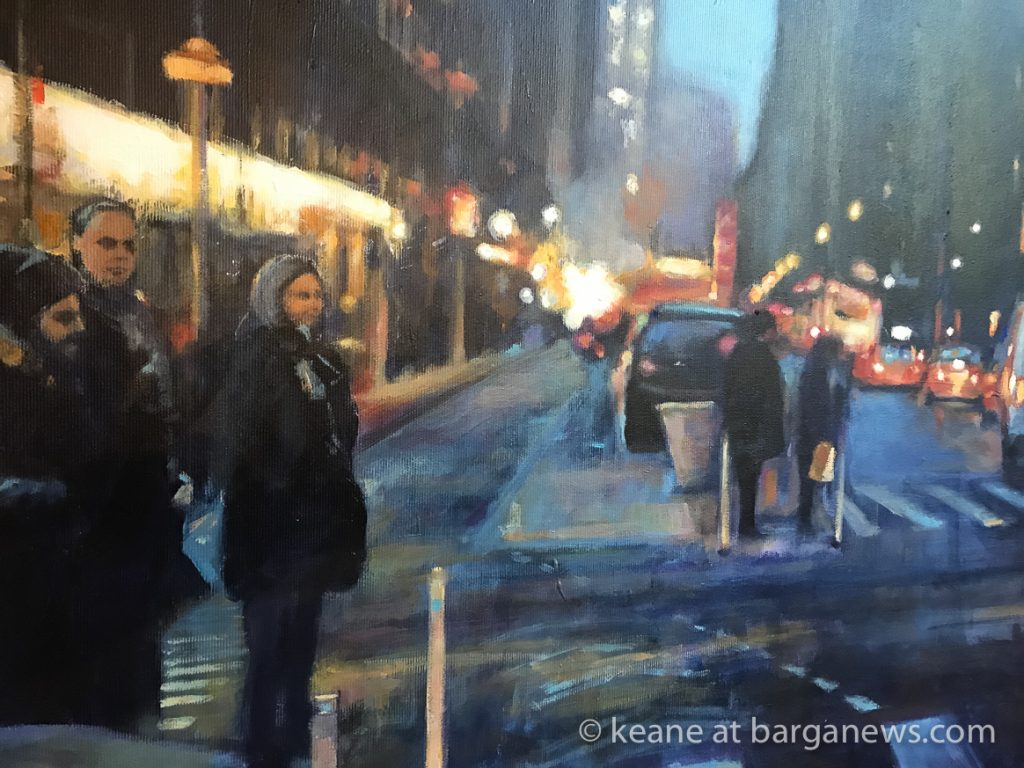 Emanuele Biagioni is a painter of cities. Yet this is too easy a description for the working methods he uses to render and recreate the voyeuristic experience of traveling through cities in our contemporary world. It’s more accurate to say that Emanuele Biagioni paints the vistas of a solitary traveler as he moves through Western metropolises. Inspired by crowds, pedestrians, traffic, cars, lights, crosswalks, what initially stands out in Biagioni’s works is the painterly finesse he applies to his works, Every detail is accounted for, and is rendered with neither more or less care than it requires. Coming from a realist tradition, viewers seem to inhabit the cities Biagioni paints alongside him, like a friend on an otherwise lonely journey.