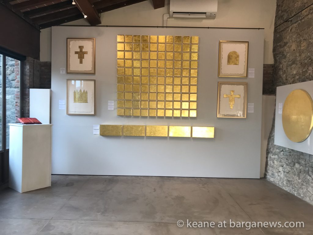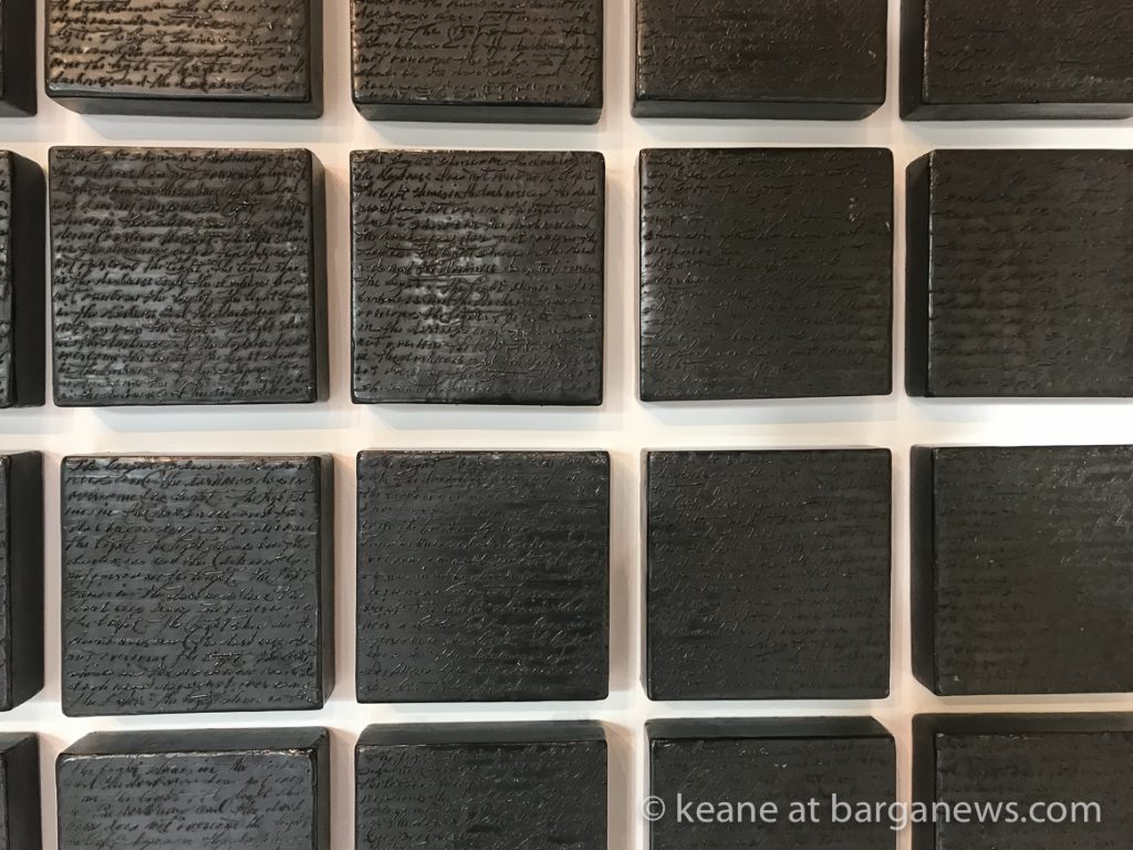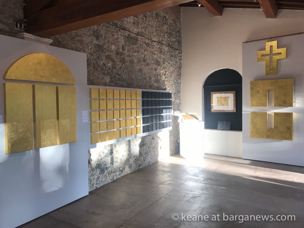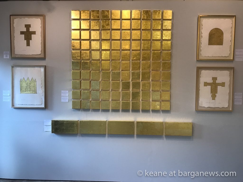 Two multi-panel installations are featured in Reflections of Glory. Forty encaustic gilded panels and forty black panels that are incised with text, become 40 Days/40 Nights. Another multi-panels work has 100 5”x 5” gilded squares entitled One Hundred Percent.