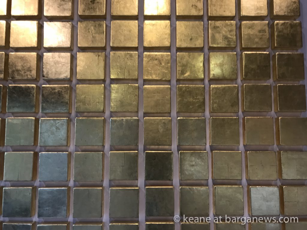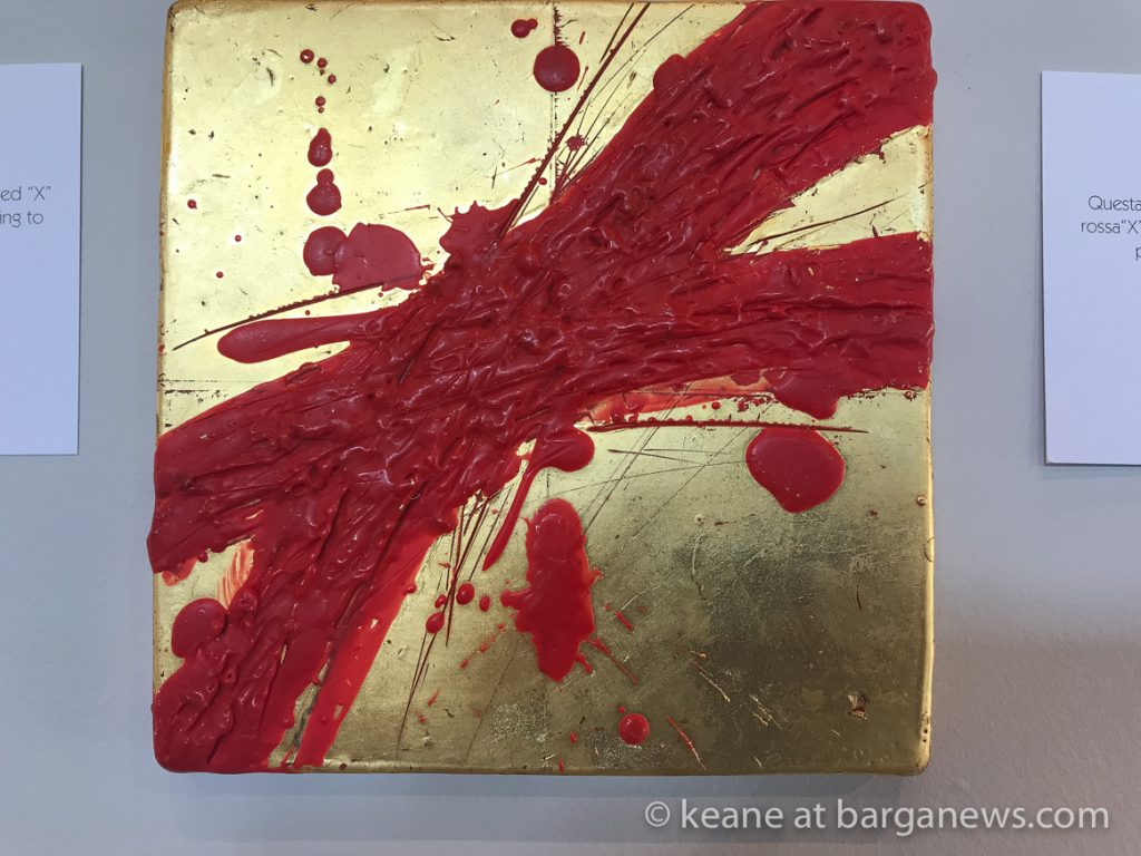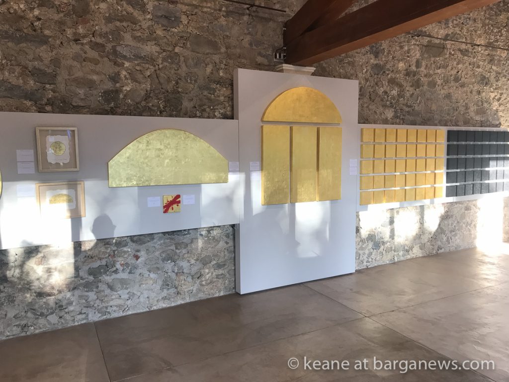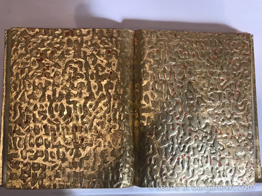 Two multi-panel installations are featured in Reflections of Glory. Forty encaustic gilded panels and forty black panels that are incised with text, become 40 Days/40 Nights. Another multi-panels work has 100 5”x 5” gilded squares entitled One Hundred Percent.